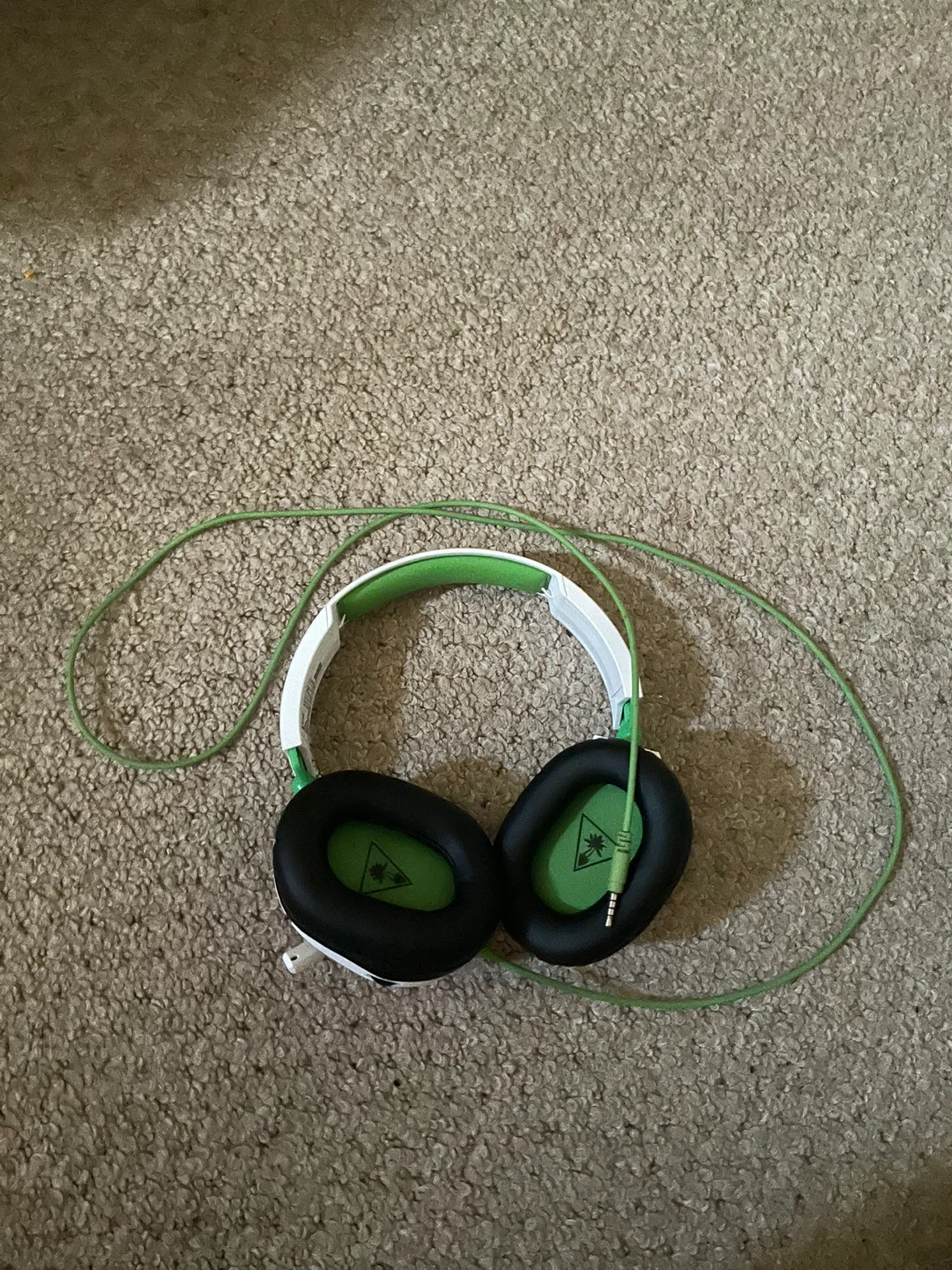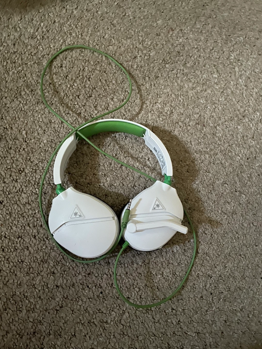 White and green wired gaming headset. Features over-ear earcups with a microphone boom. It's compatible with various gaming consoles and PCs. Great for online gaming sessions!