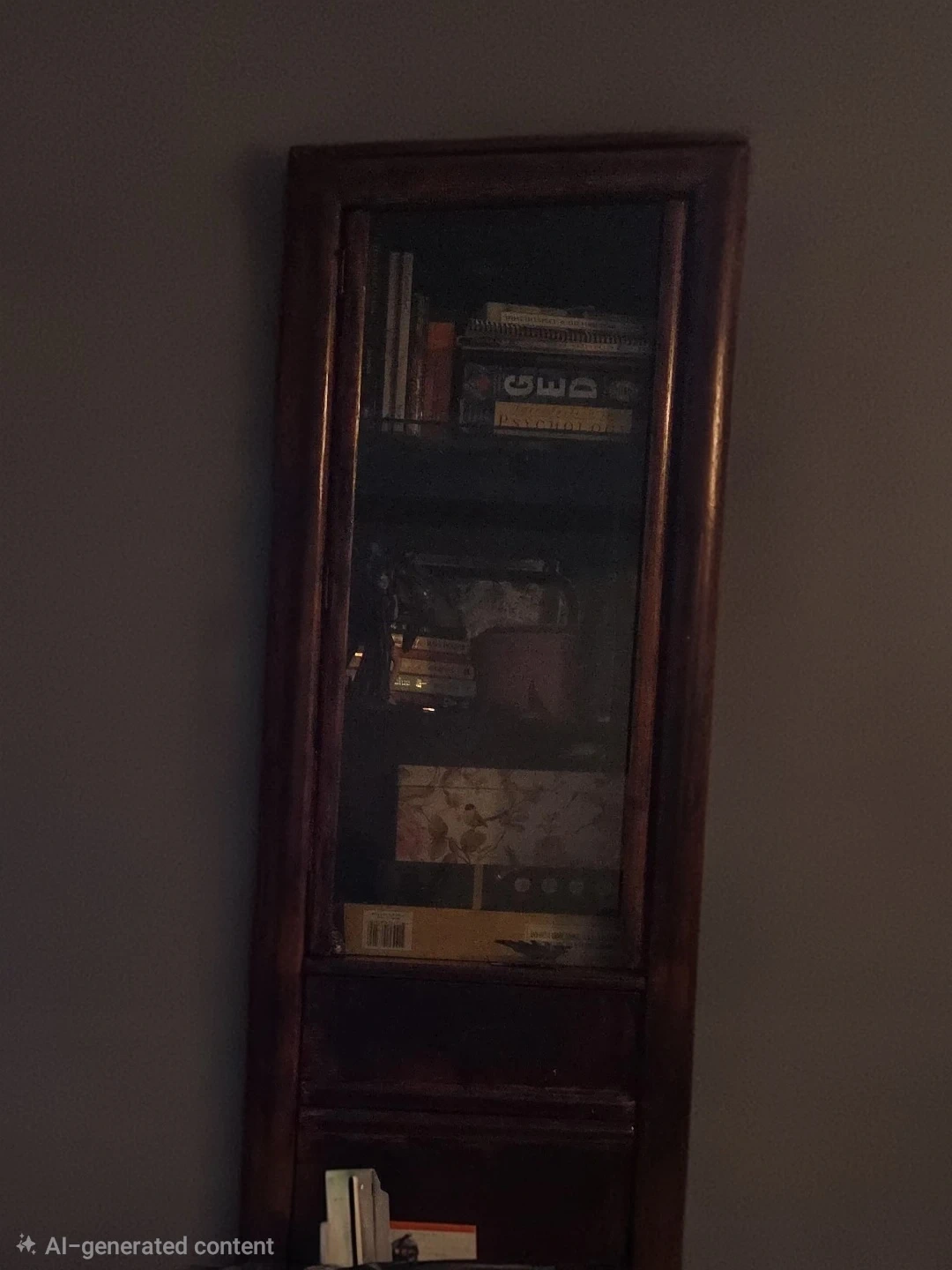 This is a wooden display cabinet with a glass door, two drawers and a spot for stoarage in the bottom. Very nice good for kitchen, dinningroom