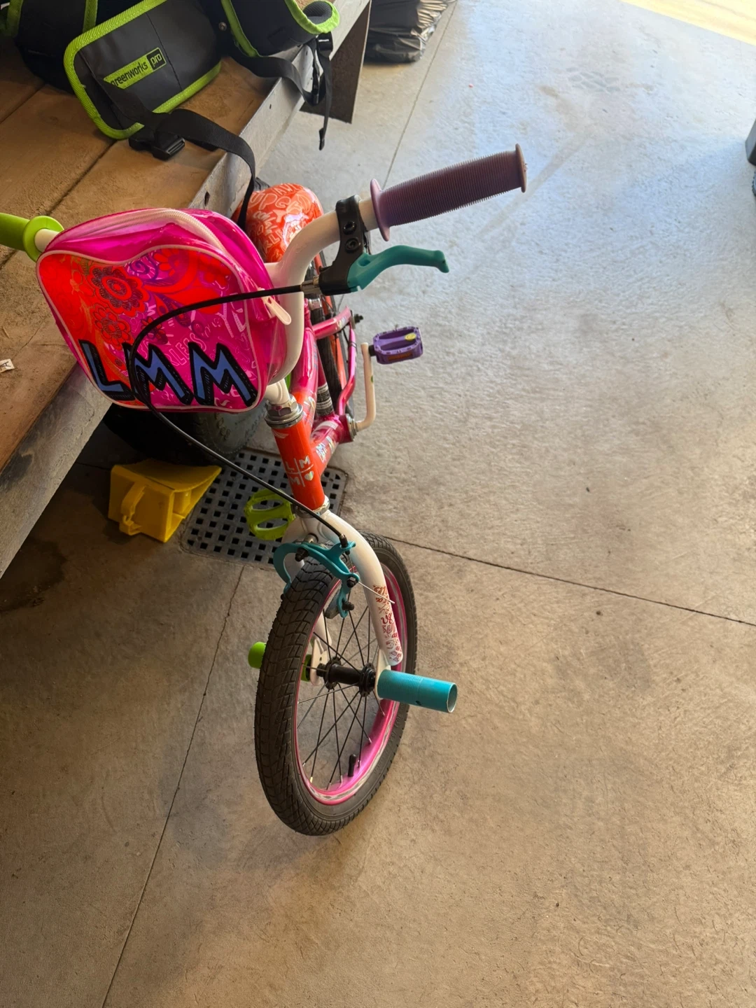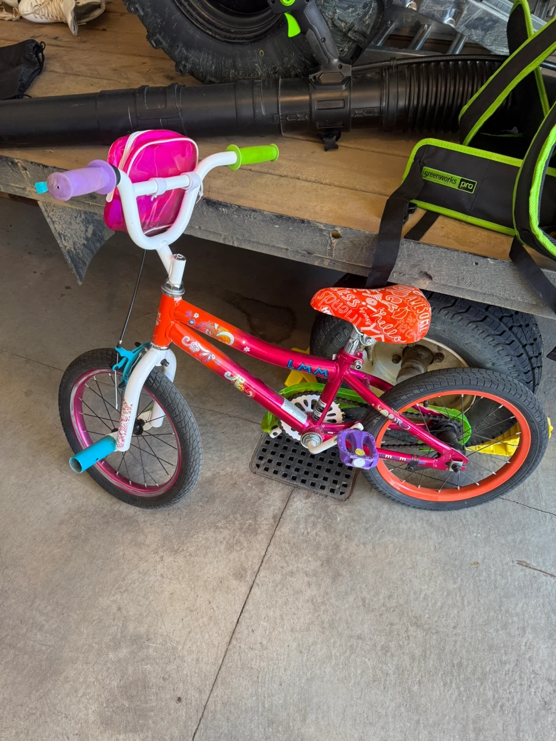 This kids' bike has a vibrant pink and orange frame with fun graphics. It features purple handlebars, bright green grips, and a pink handlebar bag. The seat is orange with a white graphic pattern. It's a sturdy option for young riders!