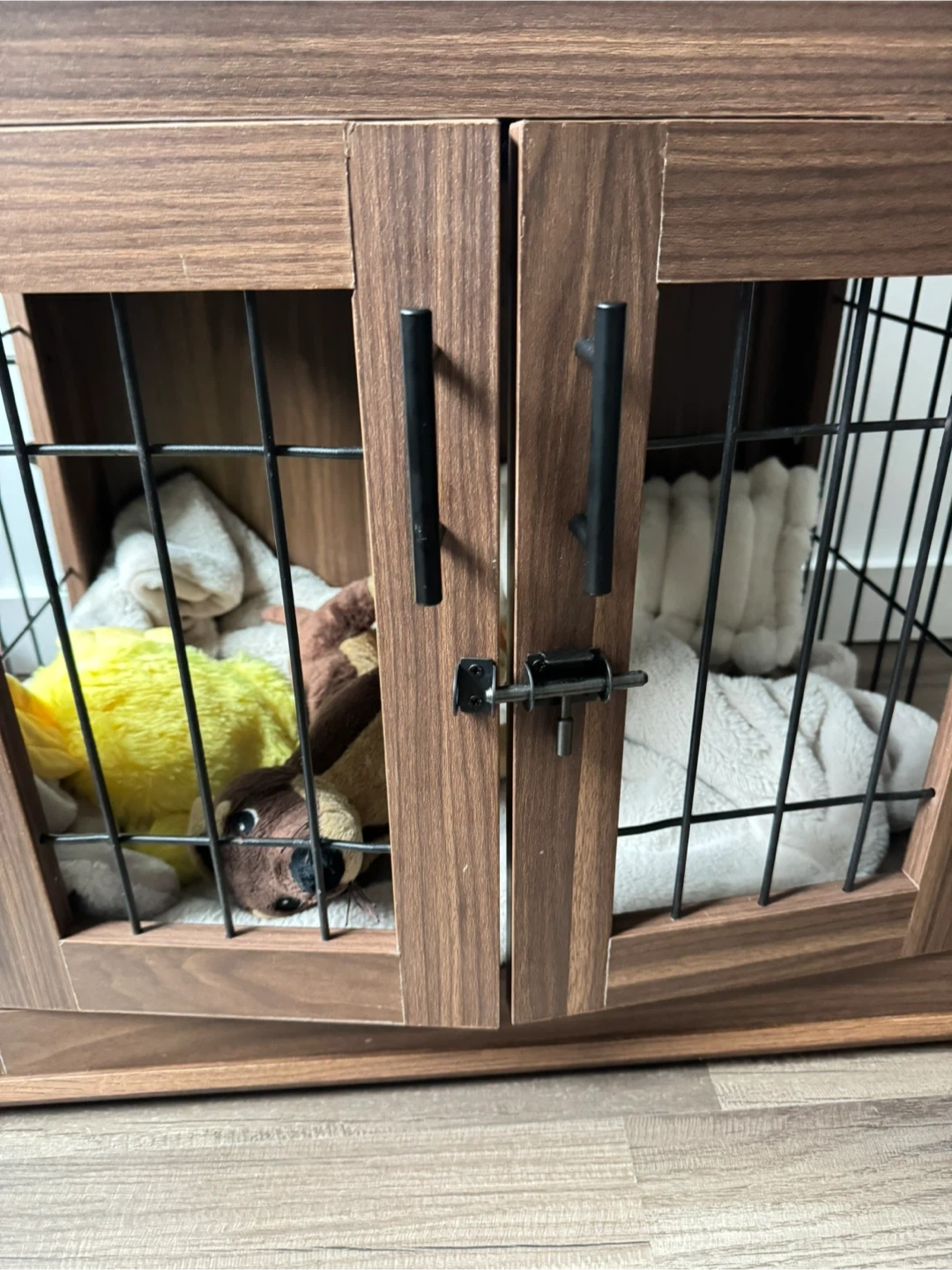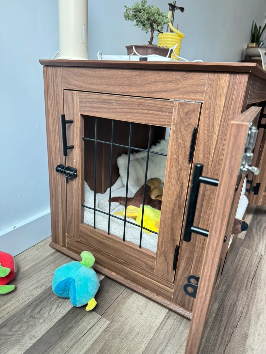 This wooden dog crate functions as an end table. It's made of dark wood with black metal accents and a latch closure. It includes a soft bedding inside.