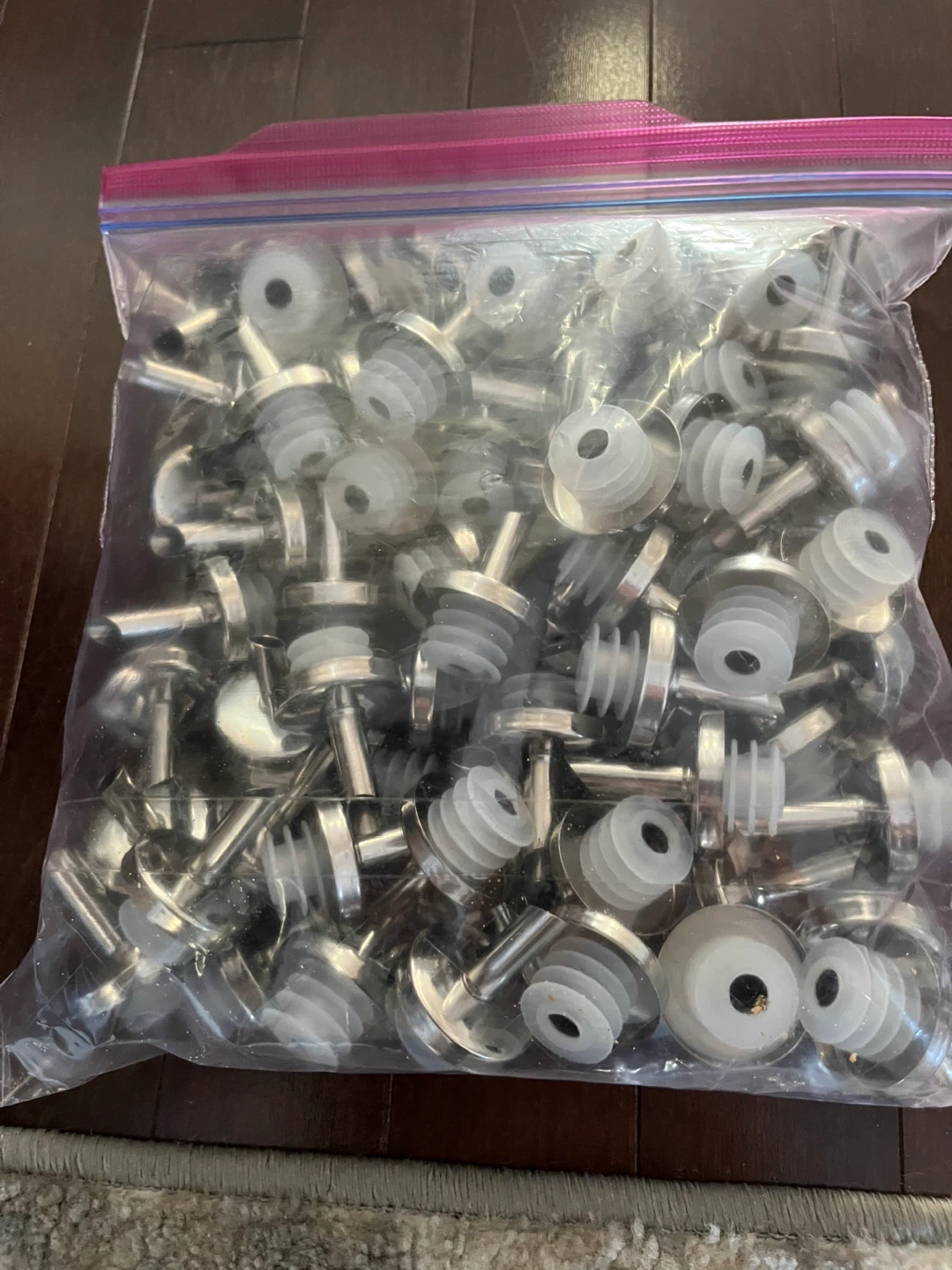 A bag of metal and silicone bottle stoppers. Great for sealing wine or other beverage bottles to keep them fresh. Each stopper has a polished metal base and a flexible white silicone insert.