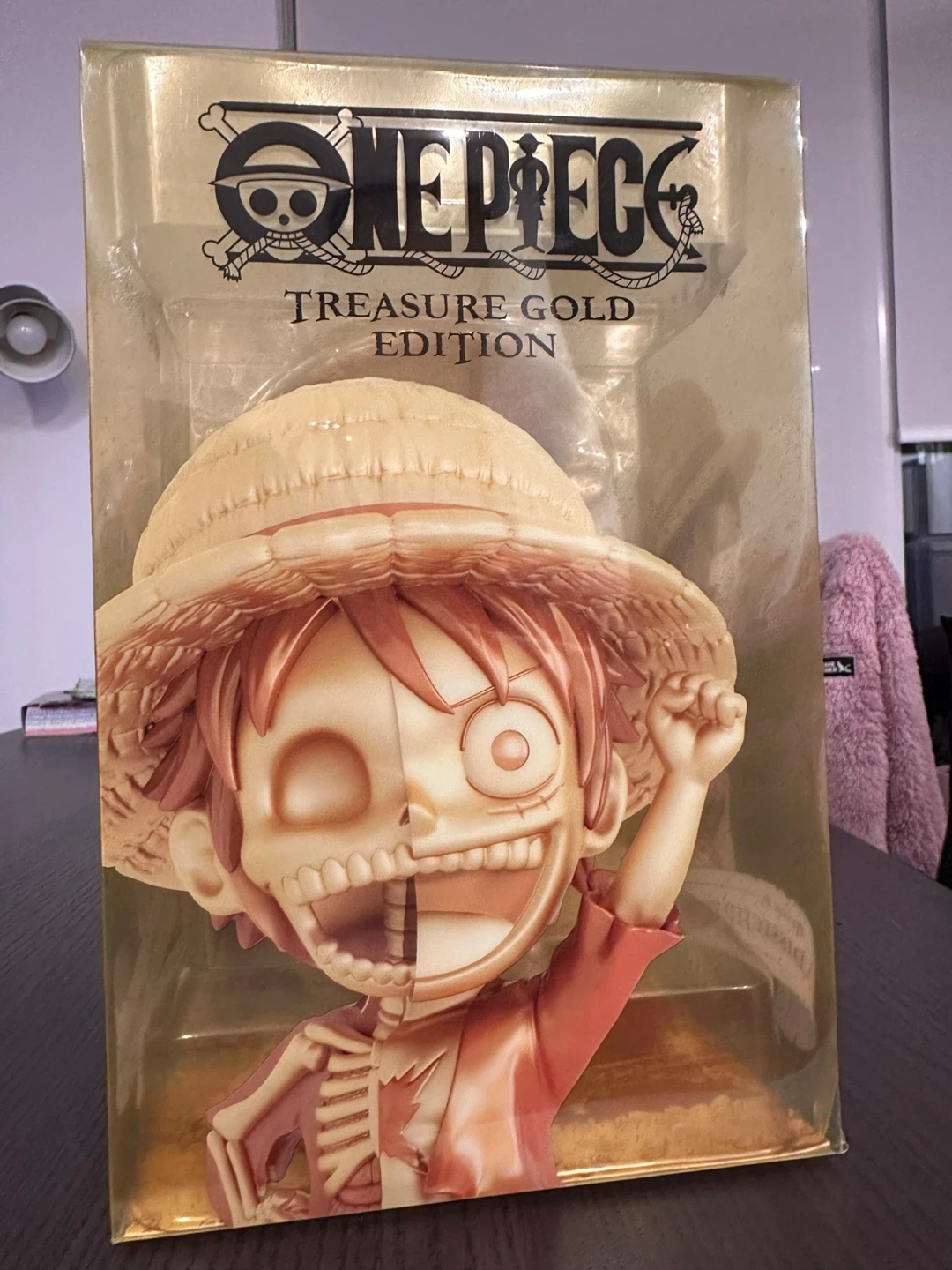 This is the One Piece Treasure Gold Edition figure. It features a unique design with half the character showing a skeleton. This collectible is perfect for any One Piece fan!