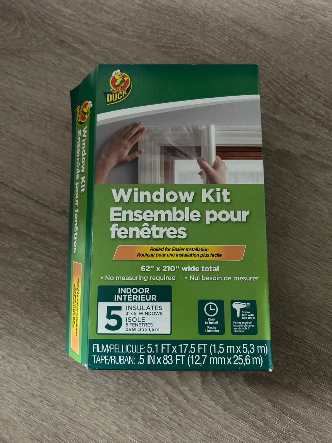 This Duck brand window kit is 62" x 210" wide. It includes film and tape for easy installation. It's designed for indoor use to insulate windows.