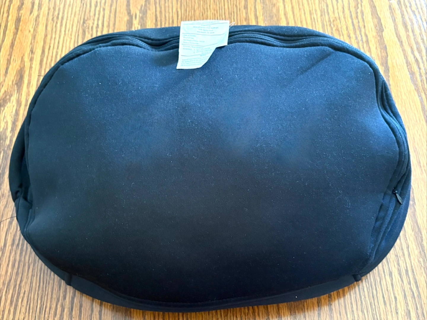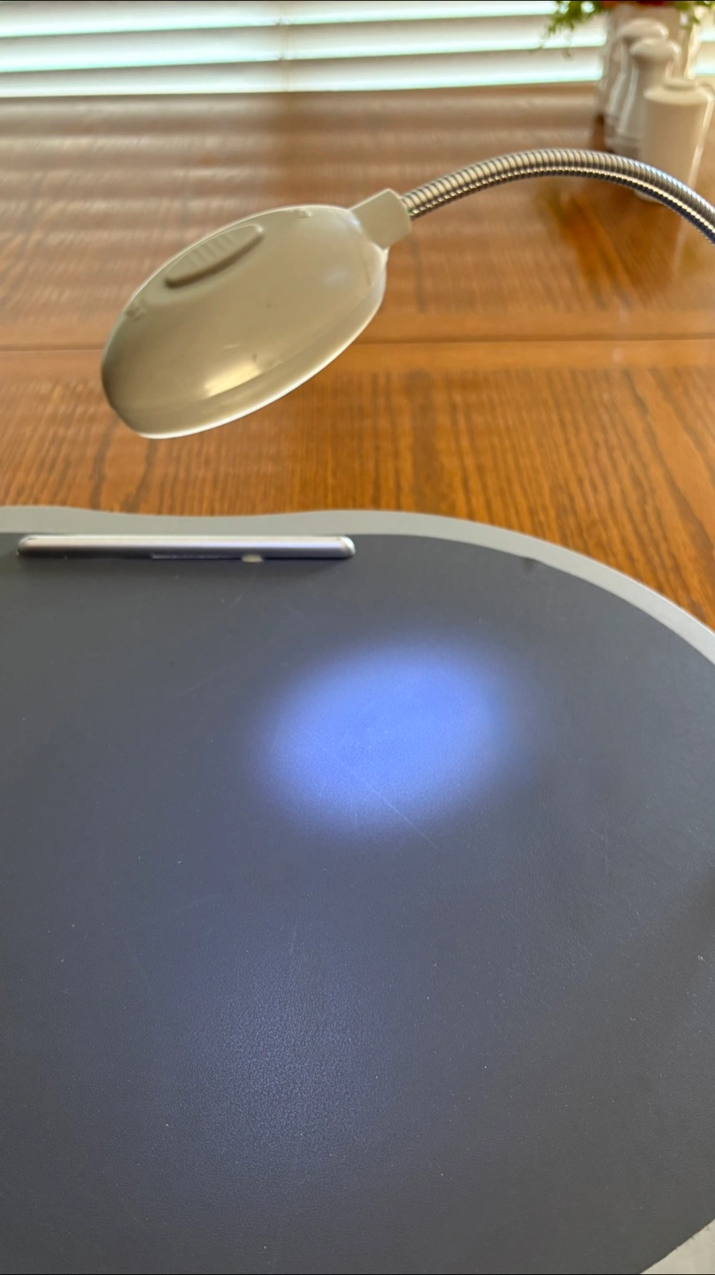This lap desk features a dark grey work surface with a silver border and a flexible LED light.
