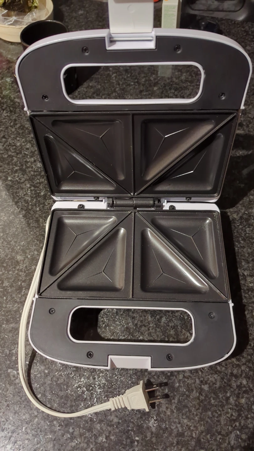 This Salton sandwich maker makes four triangle-shaped sandwiches at once. It has indicator lights for power and readiness. Non-stick plates for easy cleanup. Used once.