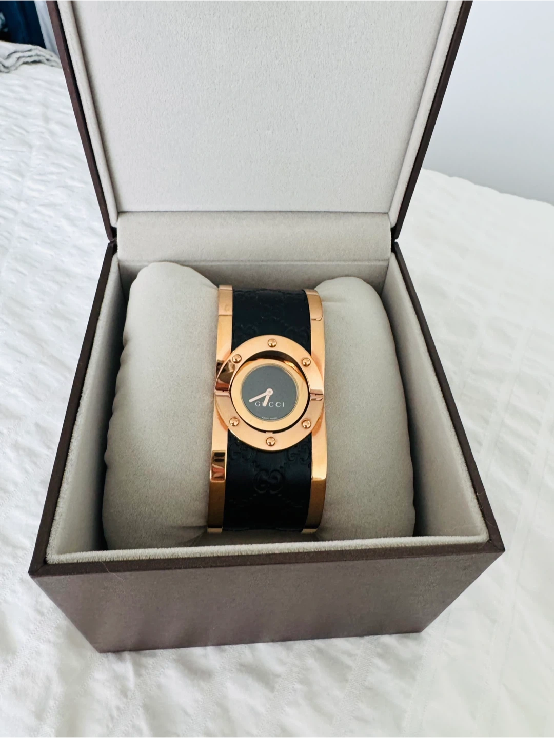 This is a Gucci cuff watch featuring a rose gold-tone metal bracelet with a black dial. It includes original packaging and extra links. It's a stylish accessory for any occasion!