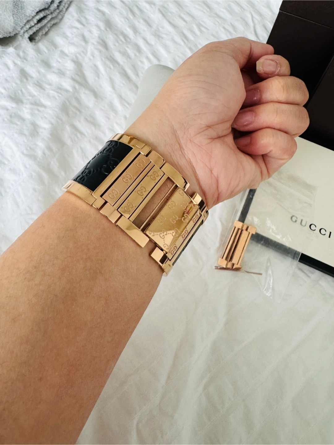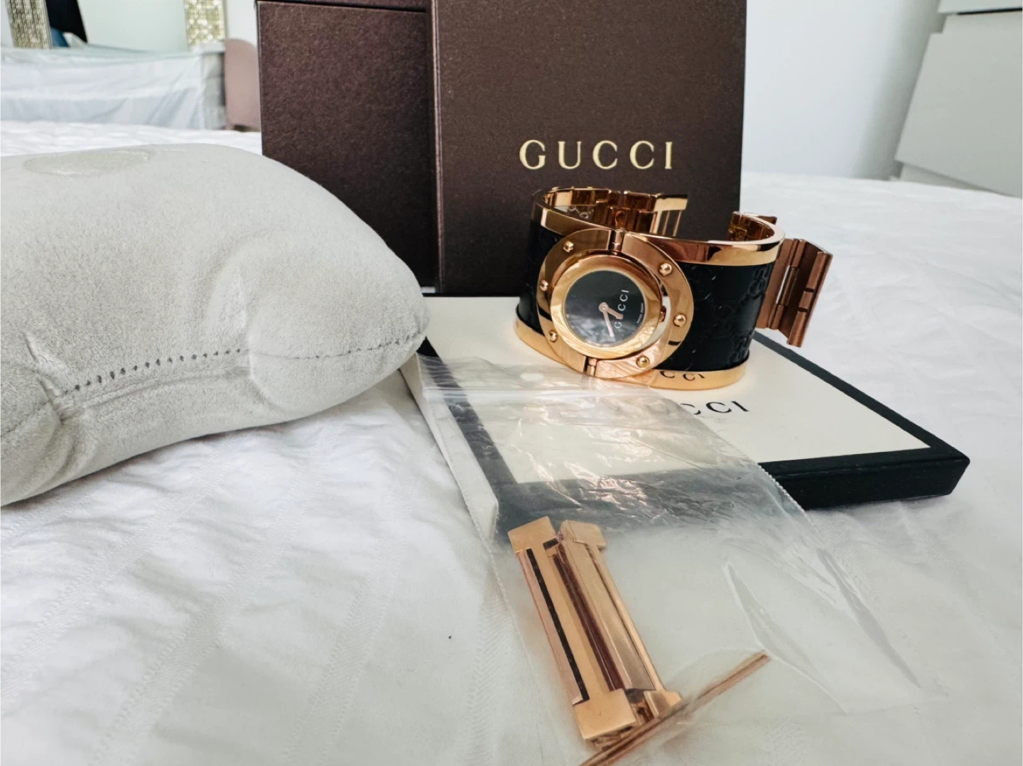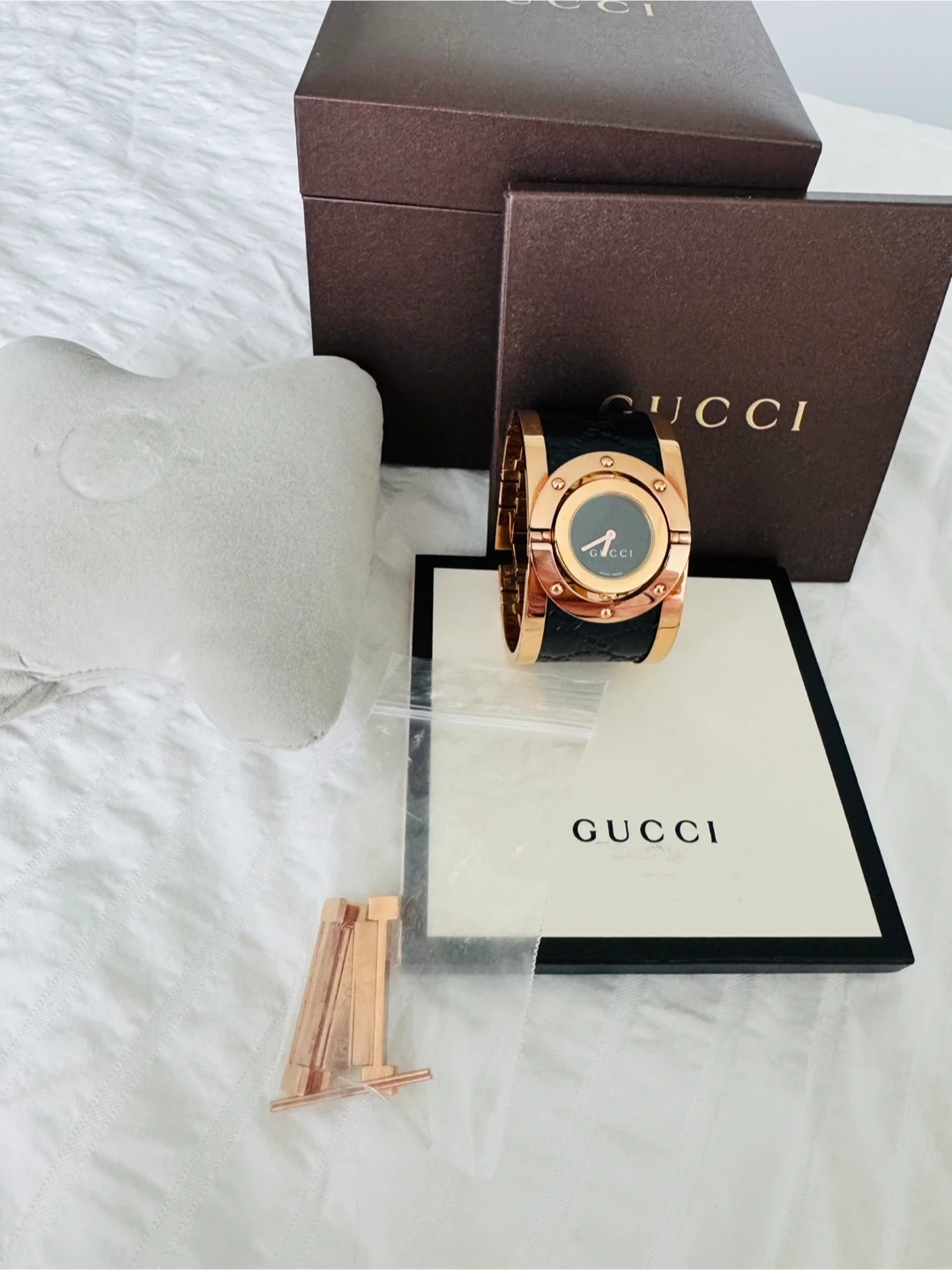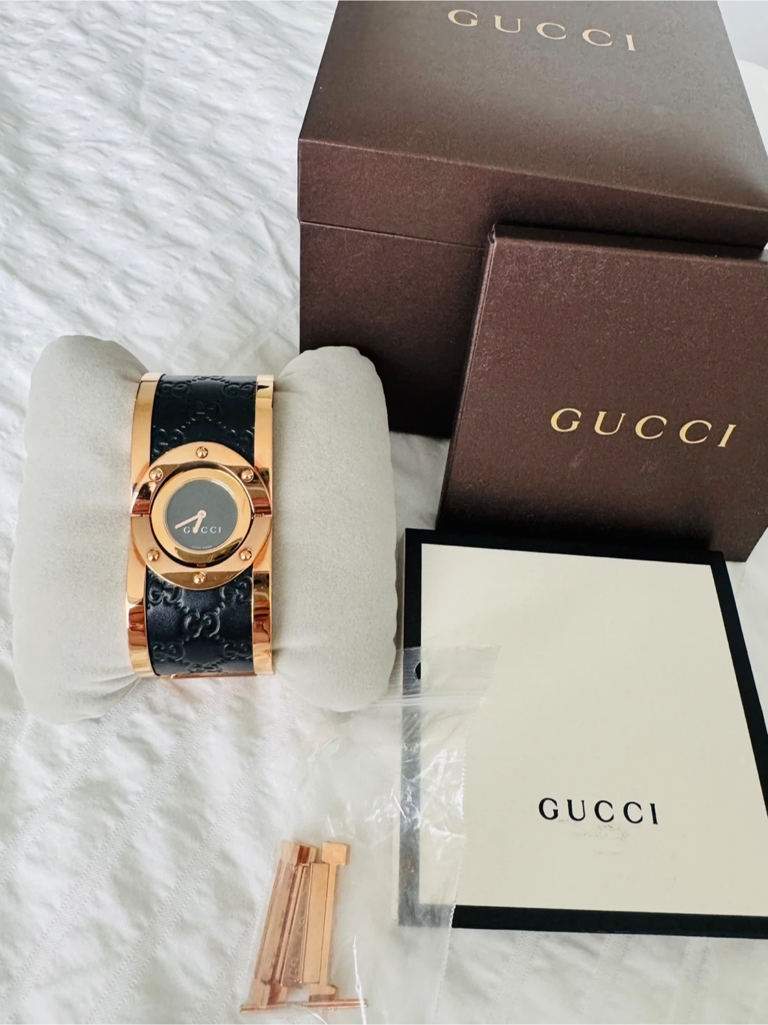 This is a Gucci cuff watch featuring a rose gold-tone metal bracelet with a black dial. It includes original packaging and extra links. It's a stylish accessory for any occasion!