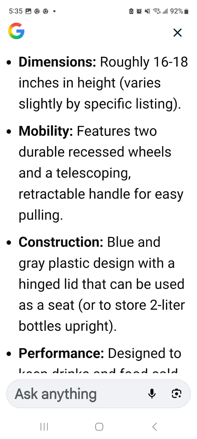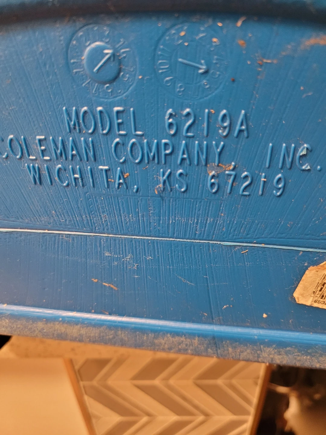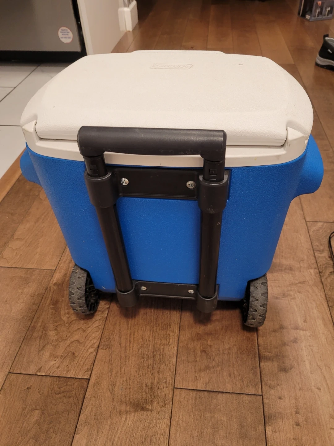This is a blue and white Coleman rolling cooler, model 6219A. It features a telescoping handle and wheels for easy transport. The inside is white and clean.