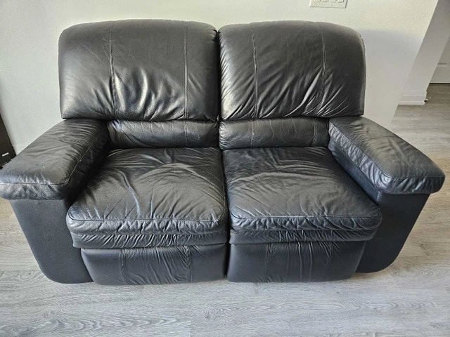 Here are some details: * Material: Leather * Colour: Black * Seating Capacity: 2 This loveseat has plenty of life left and is ready to find a new home! If the ad is up, the item is available—no need to ask! Serious inquiries only, please.