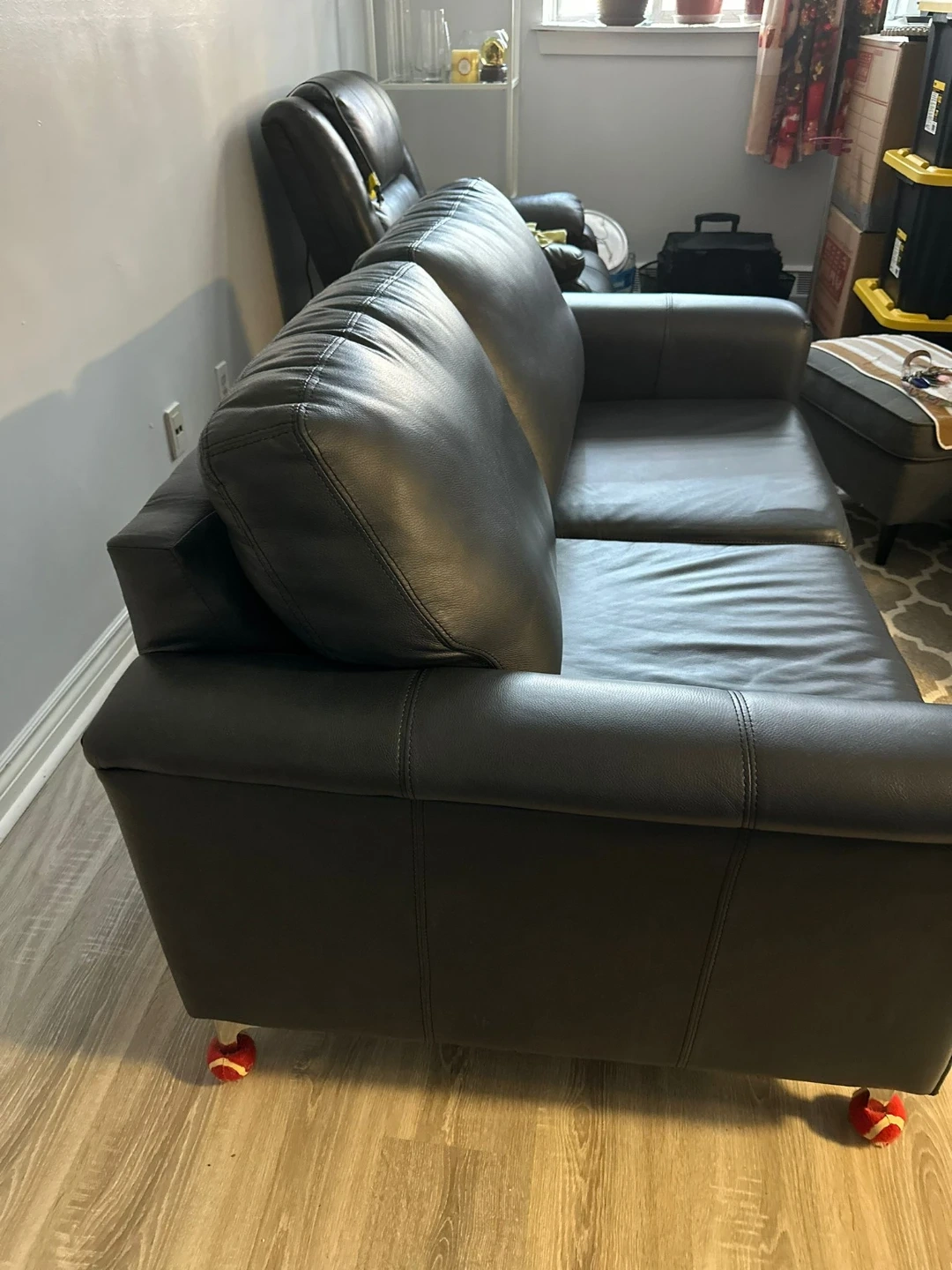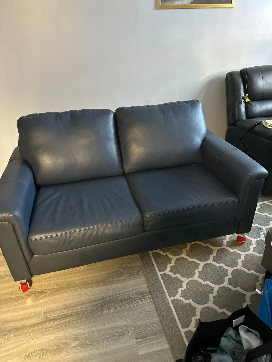 Dark blue leather loveseat sofa. It's a two-seater with comfy cushions. Made from leather material.Pick up @ Long branch, Etobicoke. Call this number 647 949 2962 now