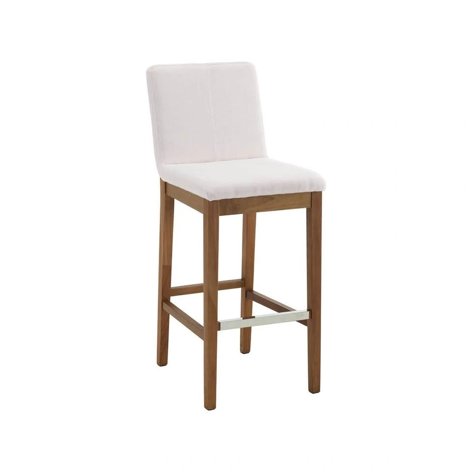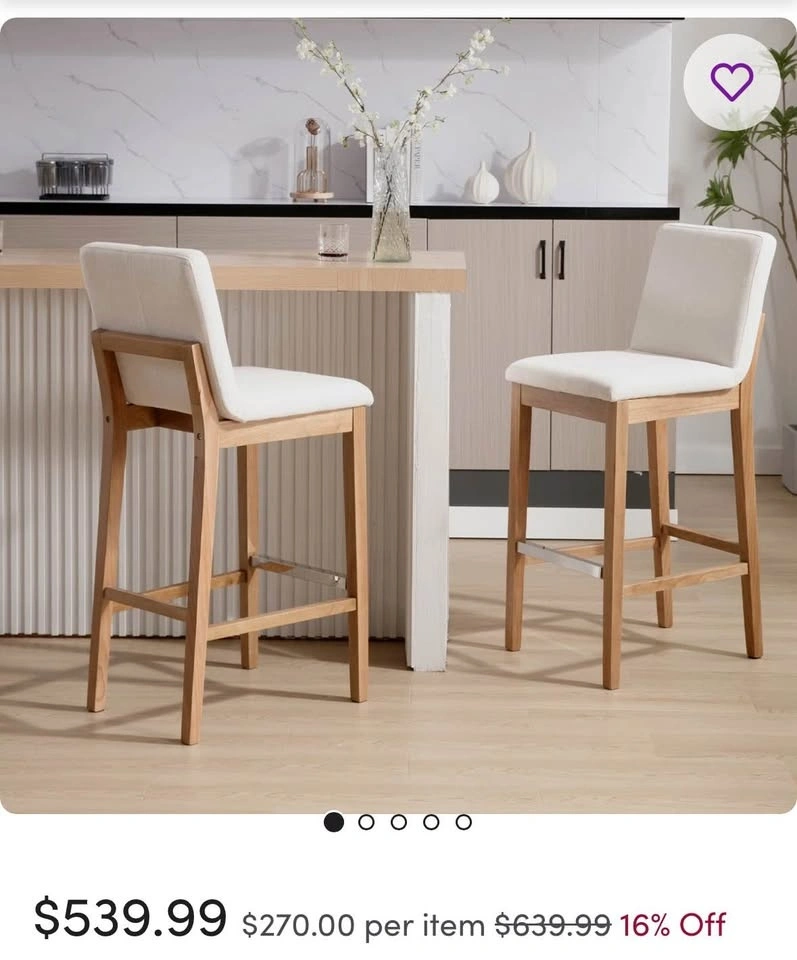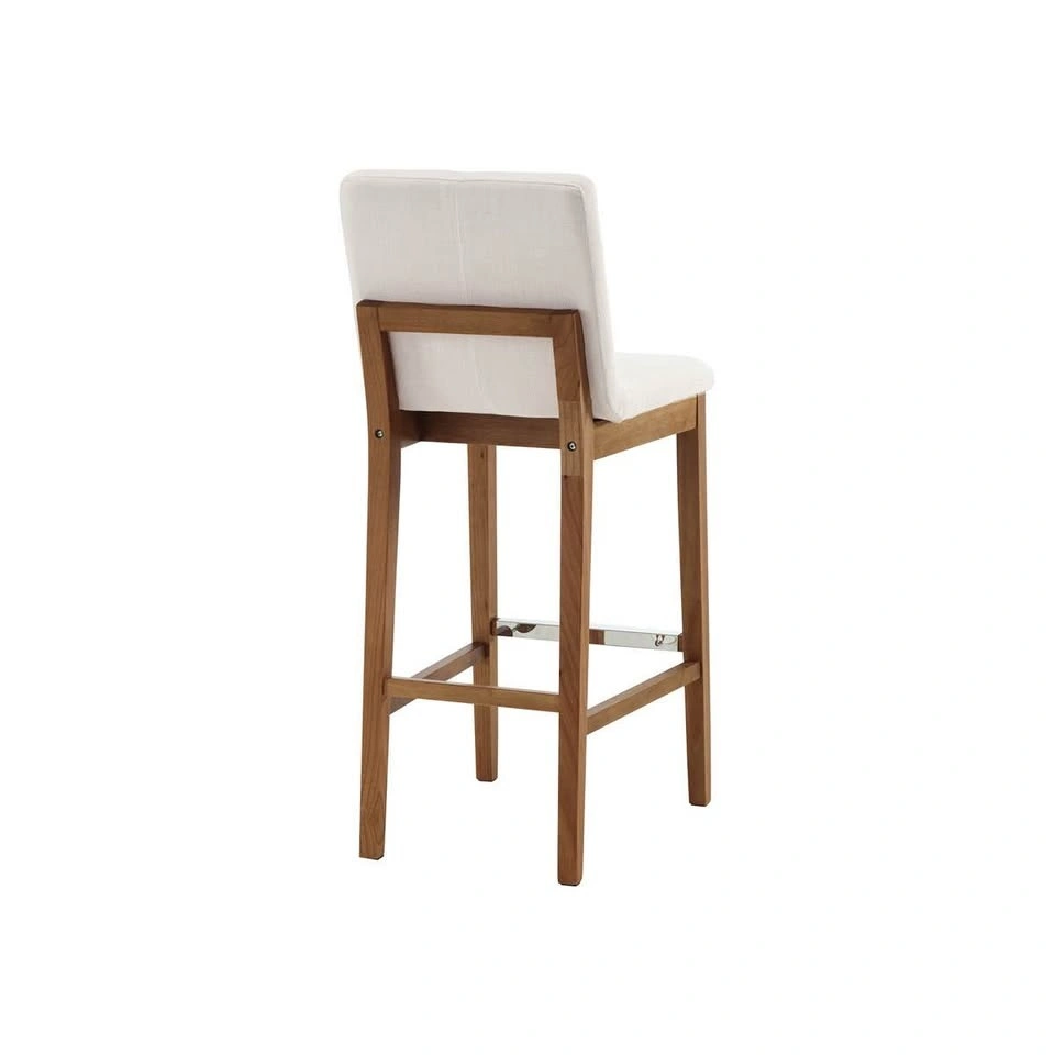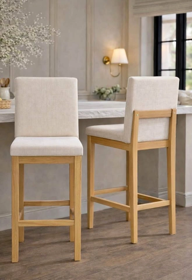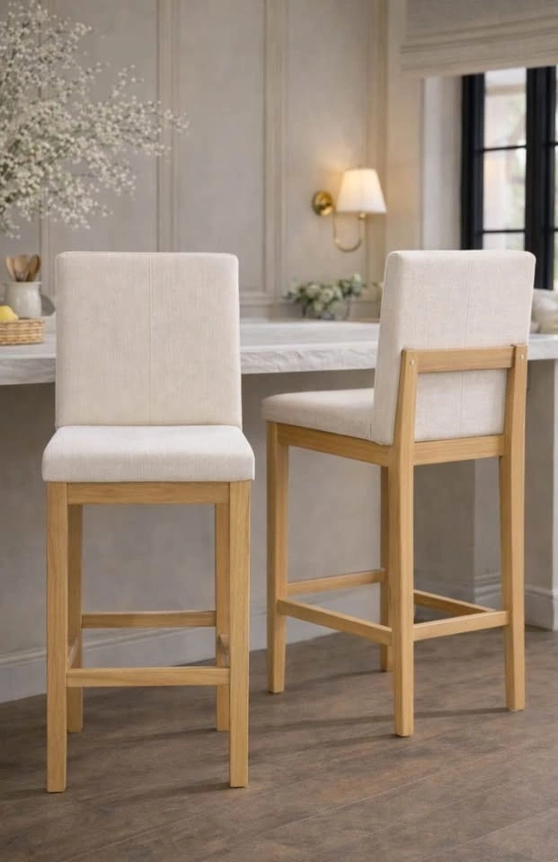 Brand new set of solid oak stools with high-density foam and a versatile light beige upholstered seat. The price listed is for the set of 2.