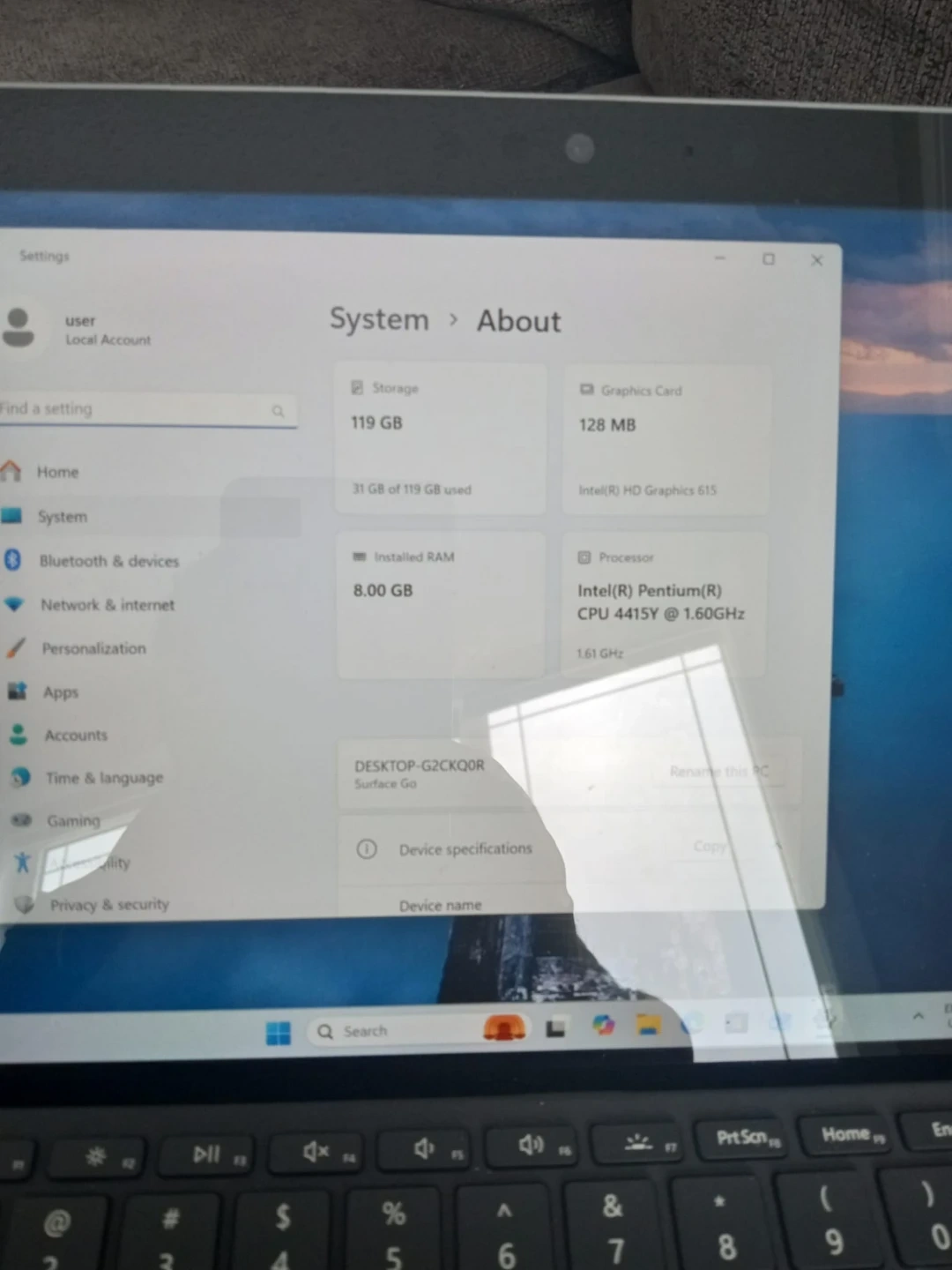 This is a Microsoft Surface Go 2-in-1 laptop tablet. It has 8.00 GB RAM and 119 GB of storage. The processor is an Intel(R) Pentium(R) CPU 4415Y @ 1.60GHz.