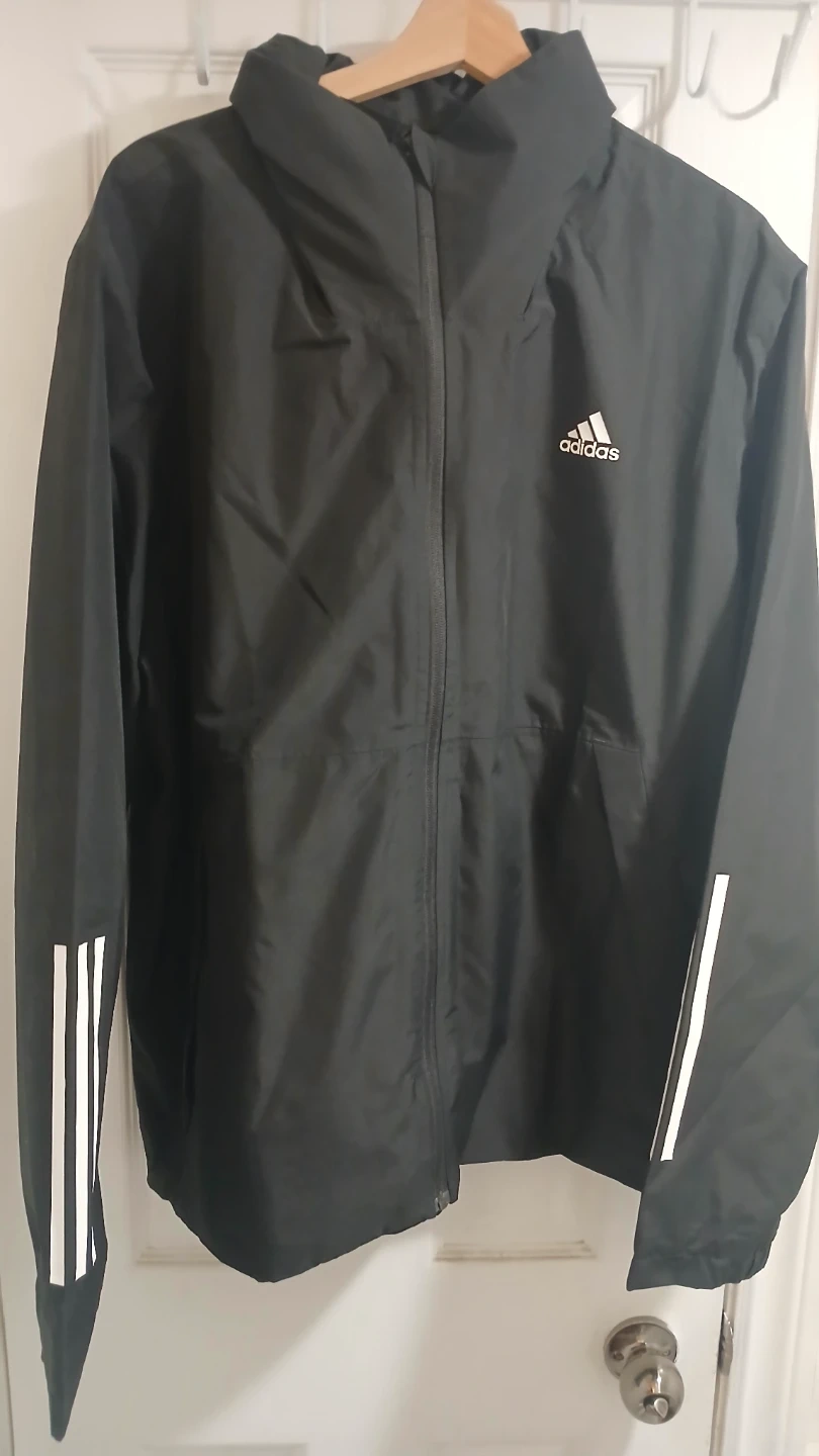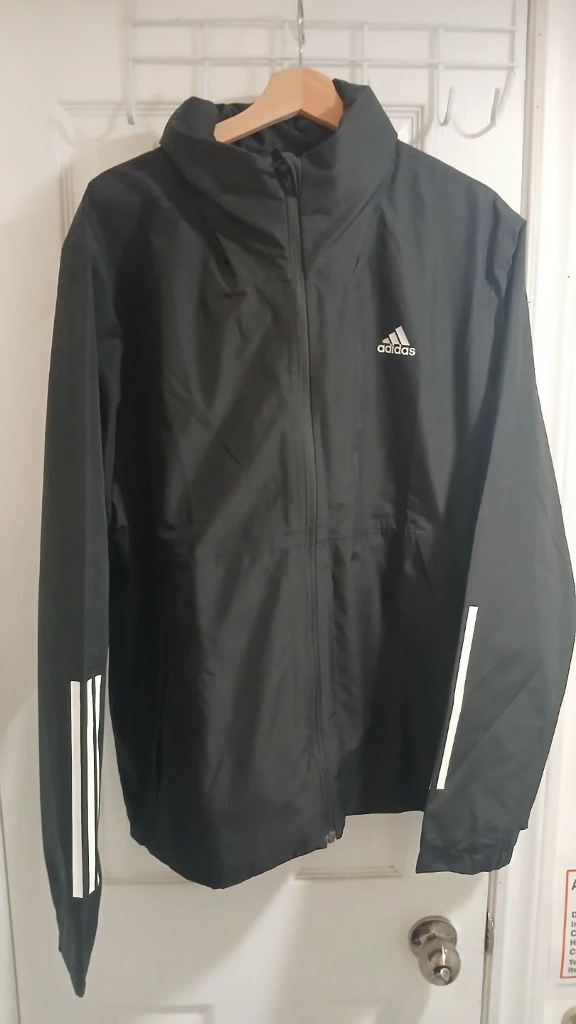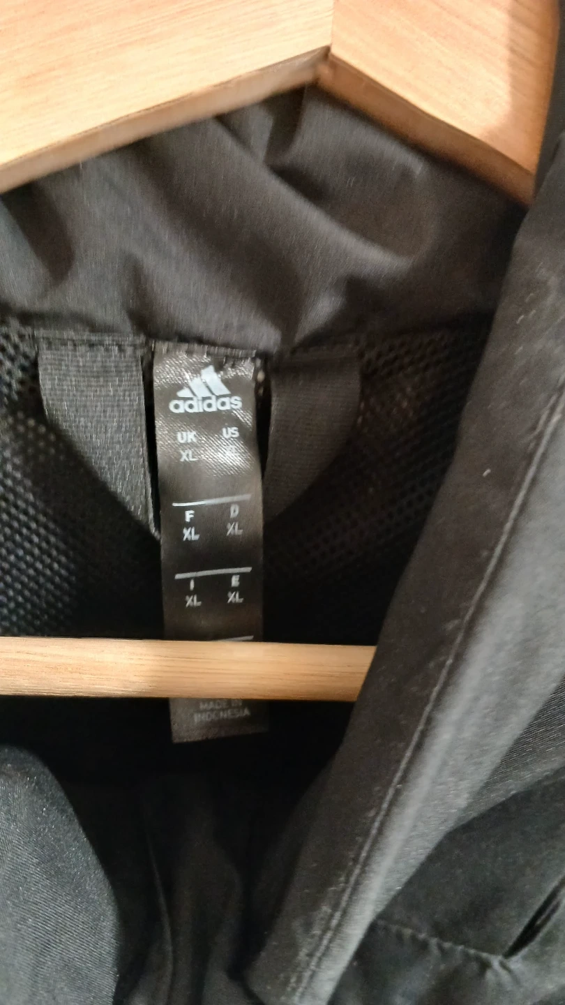 Here's a black Adidas jacket in size XL! It's in great condition and ready for a new owner. The jacket features the classic Adidas three-stripe design on the sleeves.
