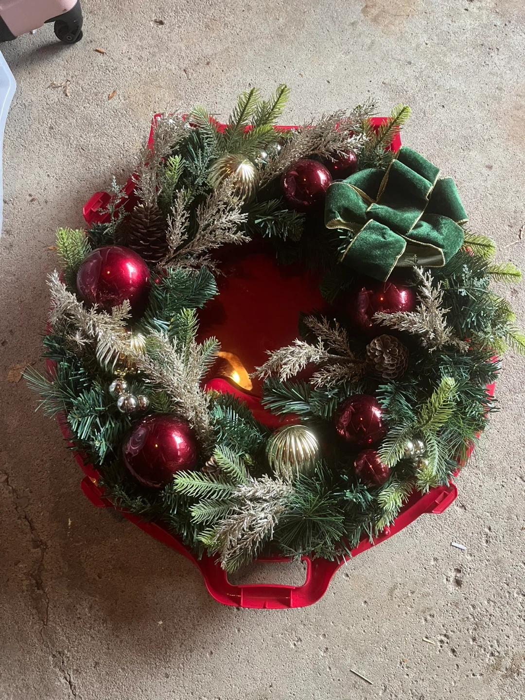 Selling a festive Christmas wreath! It's decorated with red and gold ornaments, pinecones, and a green velvet bow. Perfect for adding some holiday cheer to your home this season