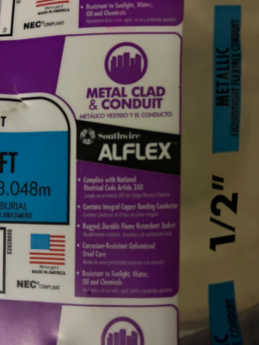 Southwire ALFLEX 1/2 in. x 10 ft. Titan Metallic Liquidtight Flexible Conduit. Body Material: PVC over galvanized steel. Brand: Southwire.