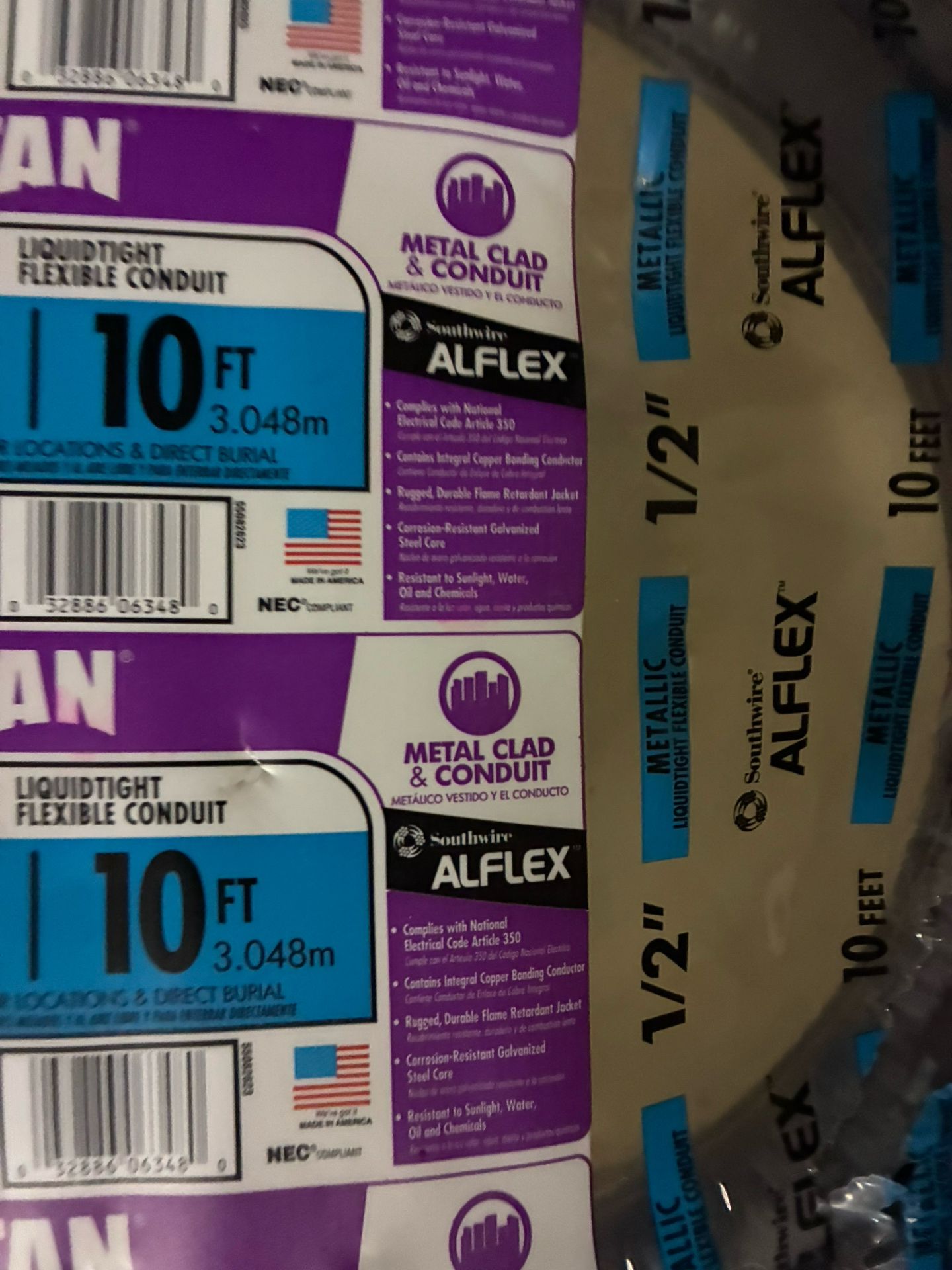 Southwire ALFLEX 1/2 in. x 10 ft. Titan Metallic Liquidtight Flexible Conduit. Body Material: PVC over galvanized steel. Brand: Southwire.