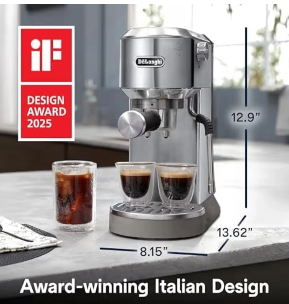 This De'Longhi Dedica Duo is a compact espresso machine made of stainless steel. It's award-winning Italian design makes it a stylish addition to any kitchen. It can brew espresso, hot & iced coffee, cappuccinos, and lattes.