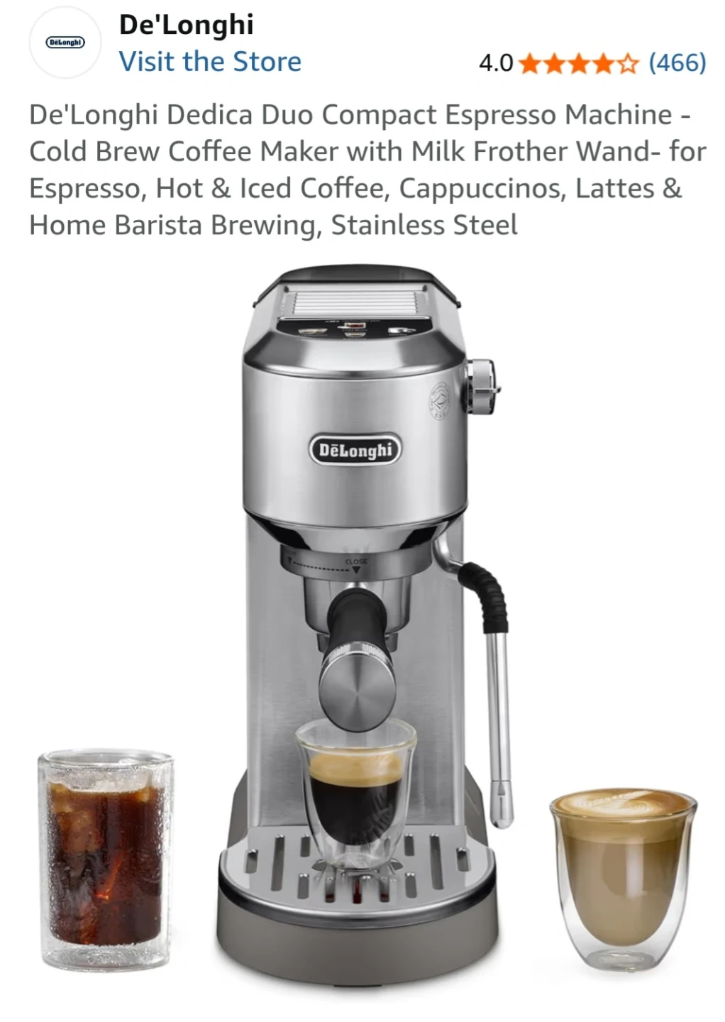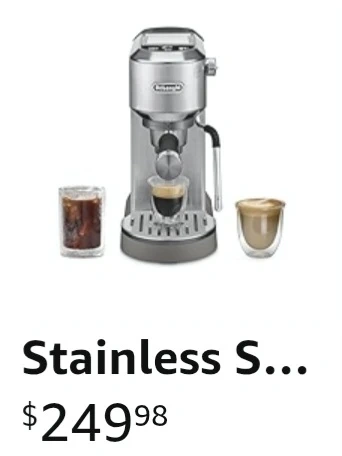 This De'Longhi Dedica Duo is a compact espresso machine made of stainless steel. It's award-winning Italian design makes it a stylish addition to any kitchen. It can brew espresso, hot & iced coffee, cappuccinos, and lattes.