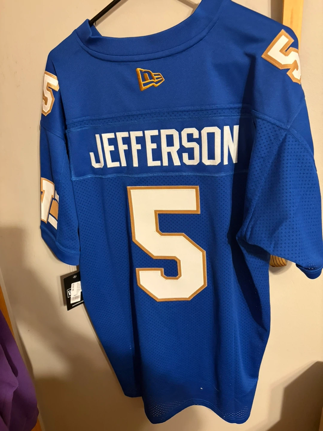 This is a blue Winnipeg Blue Bombers jersey with Jefferson printed on the back. It's size XL and made by New Era. Features #5 on the front and back.