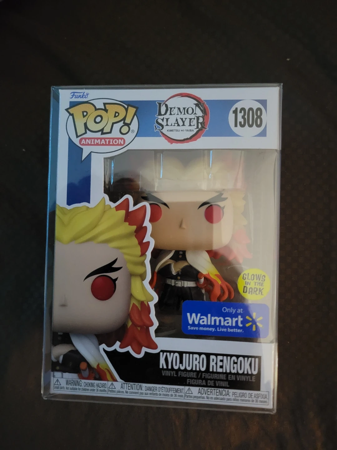 This is a Funko Pop! Animation vinyl figure of Kyojuro Rengoku from Demon Slayer, number 1308. It glows in the dark! This figure comes in its original packaging and is suitable for collectors.