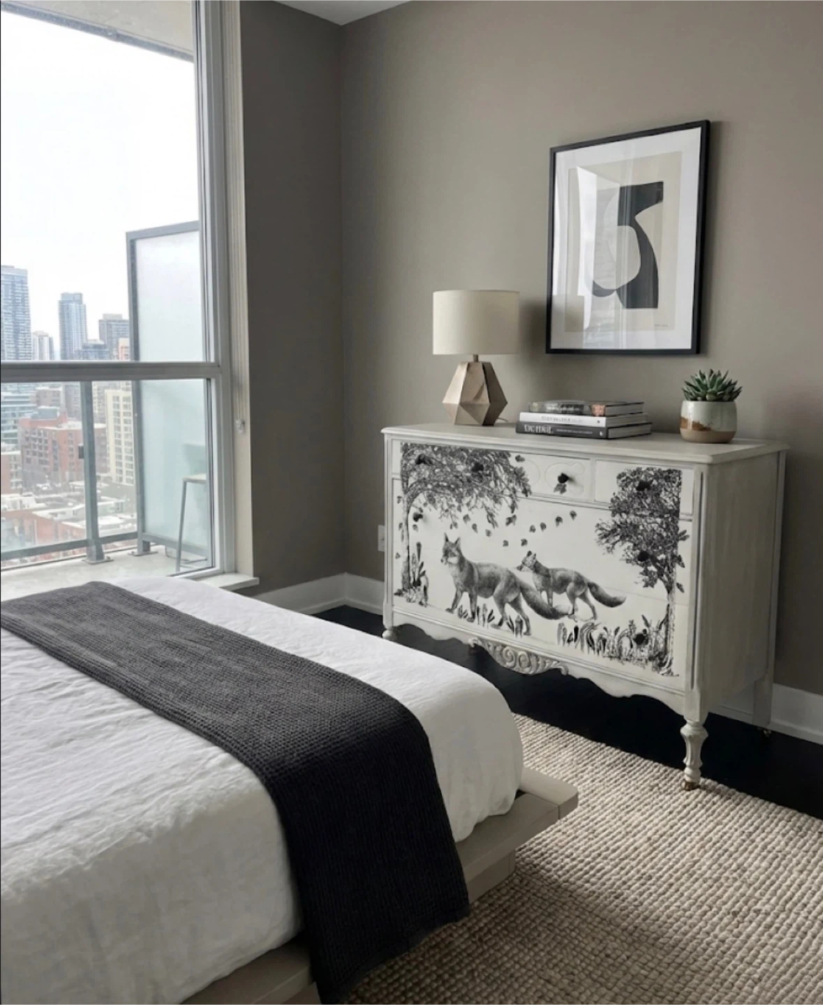 Hand-refinished in a soft, ethereal grey with a stunning black woodland scene, this piece isn't just furniture—it’s a conversation starter. Whether it’s for a whimsical nursery, a cozy entryway, or a unique bedroom statement, this fox duo adds a touch of nature’s peace to your space.
