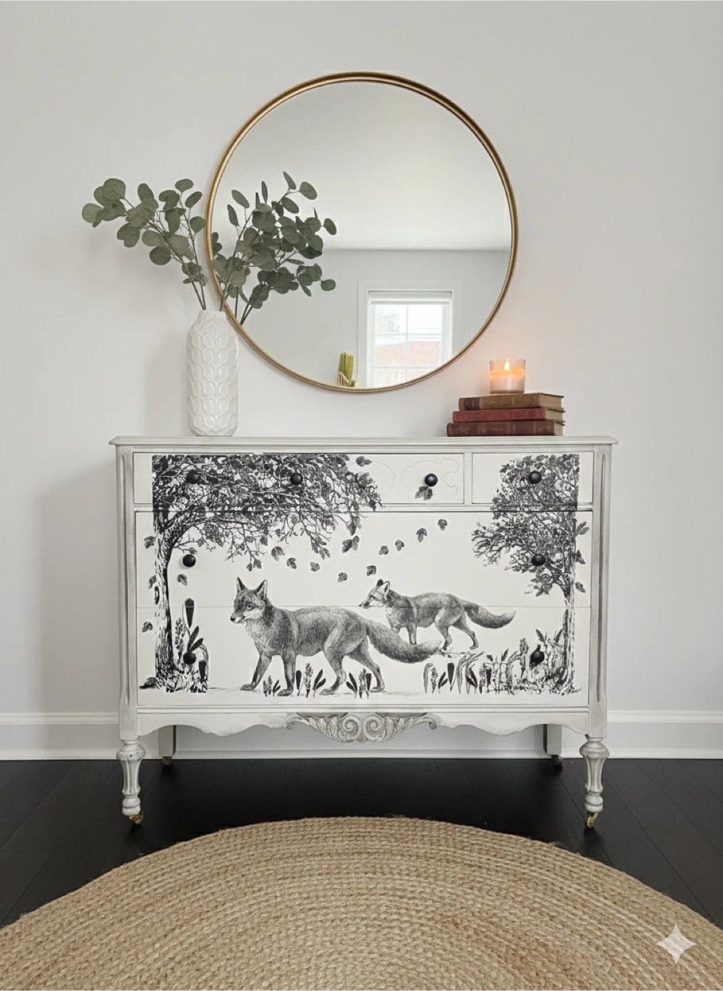 Fall in love with this one-of-a-kind "Enchanted Fox" vintage dresser. 🦊🌲