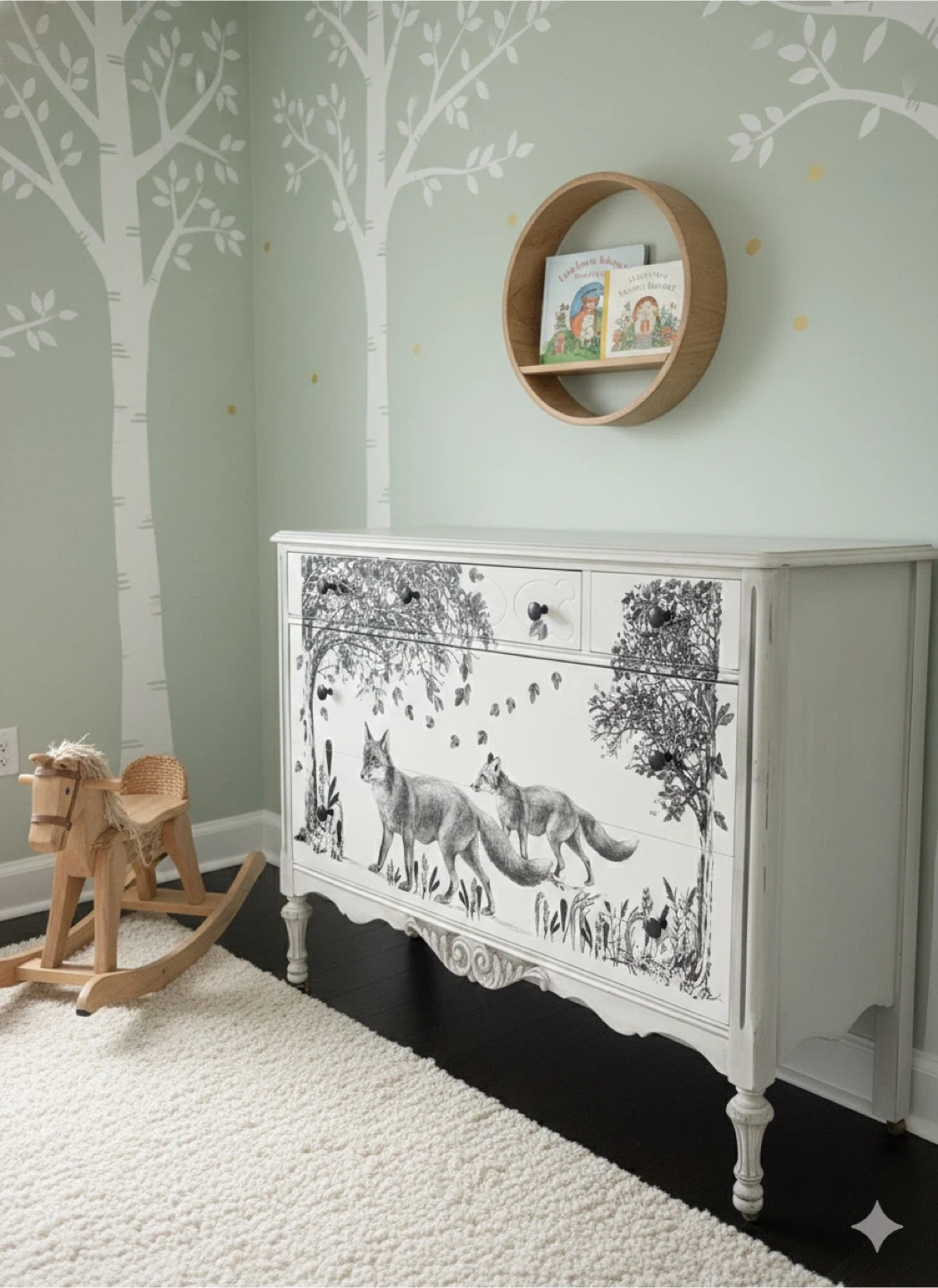 Fall in love with this one-of-a-kind "Enchanted Fox" vintage dresser. 🦊🌲