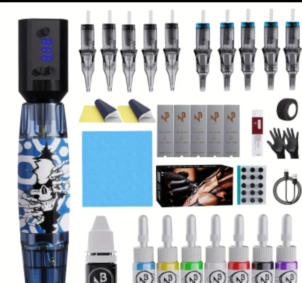 I'm selling a complete tattoo pen kit. It includes the pen itself, a variety of needles, and a set of different colored inks. Also included are gloves, a practice skin, and other accessories to get you started. Great for beginners!