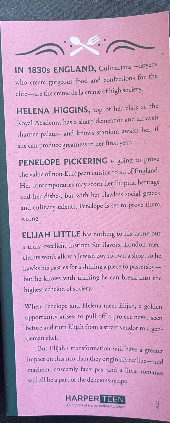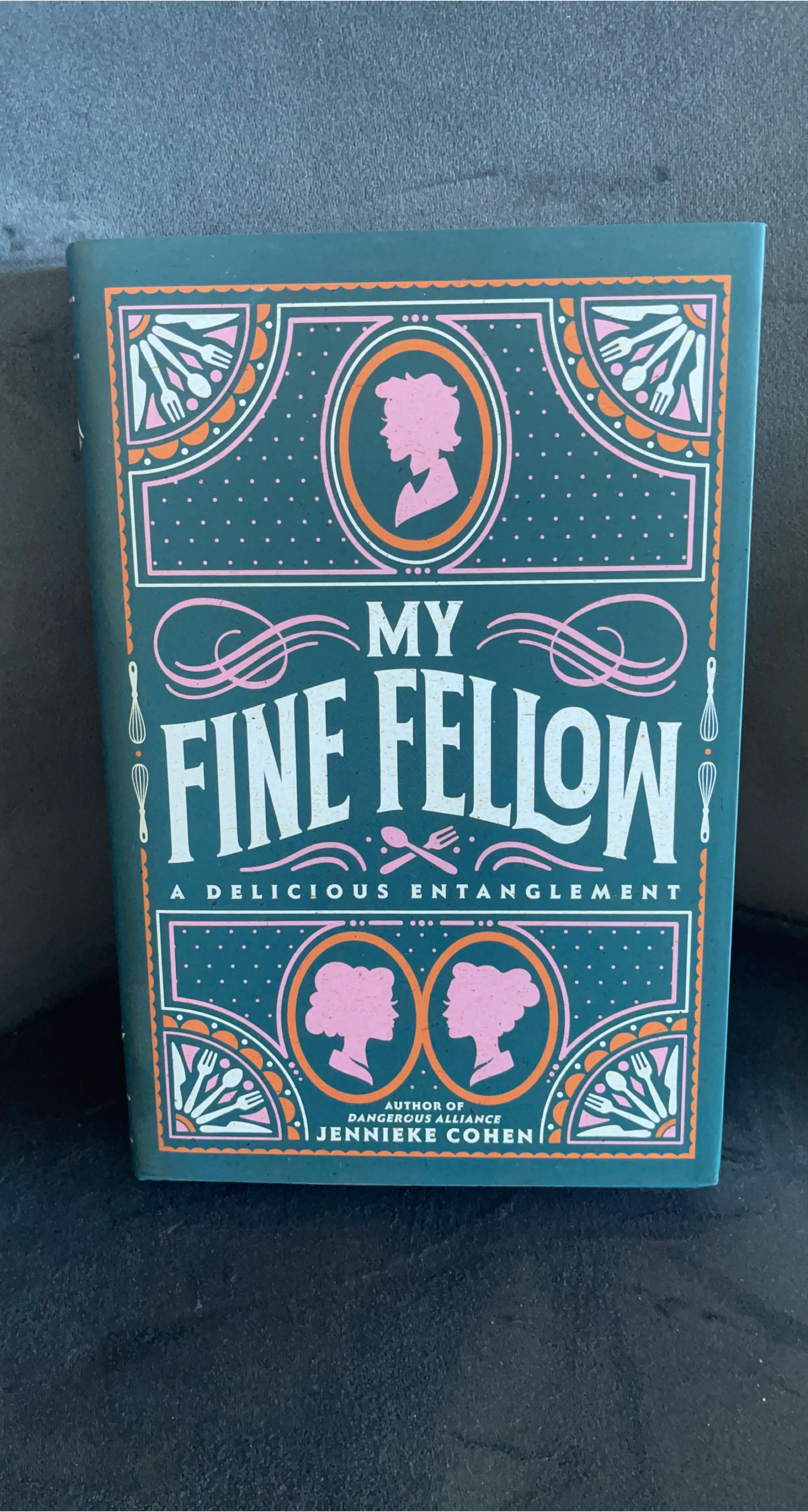Selling the book My Fine Fellow: A Delicious Entanglement by Jennieke Cohen. It's a Harper Teen book set in 1830s England, featuring culinary delights and social intrigue. A charming read!