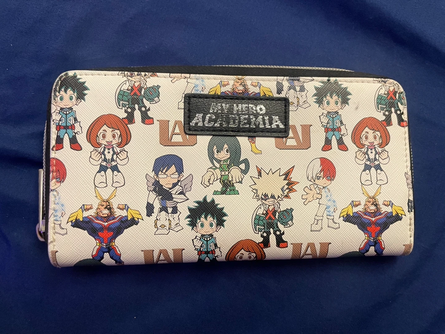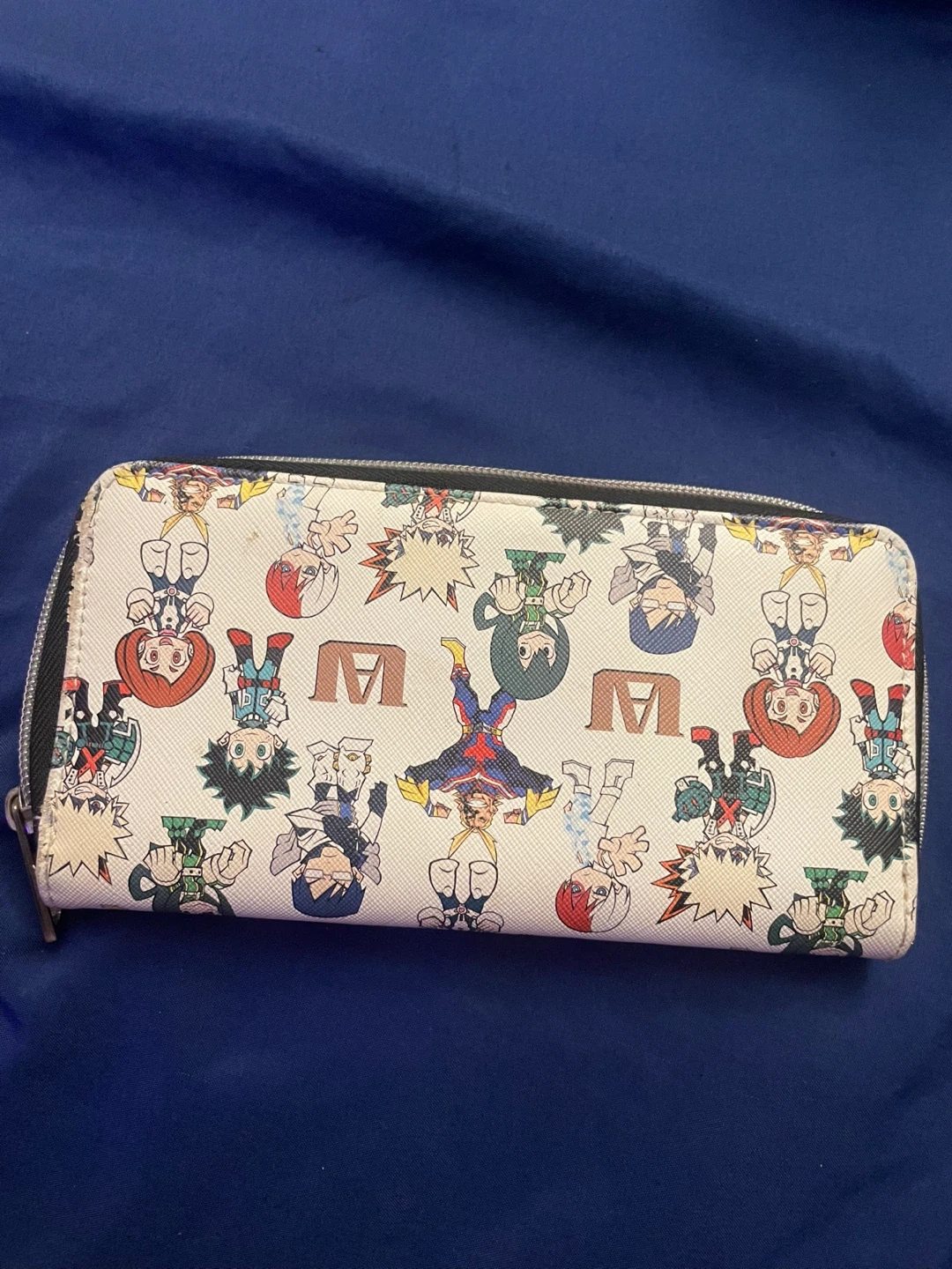 selling a My Hero Academia wallet. it features season 1 characters from the anime. it has a zip closure and multiple compartments inside. it’s a little rundown, but completely clean and usable.