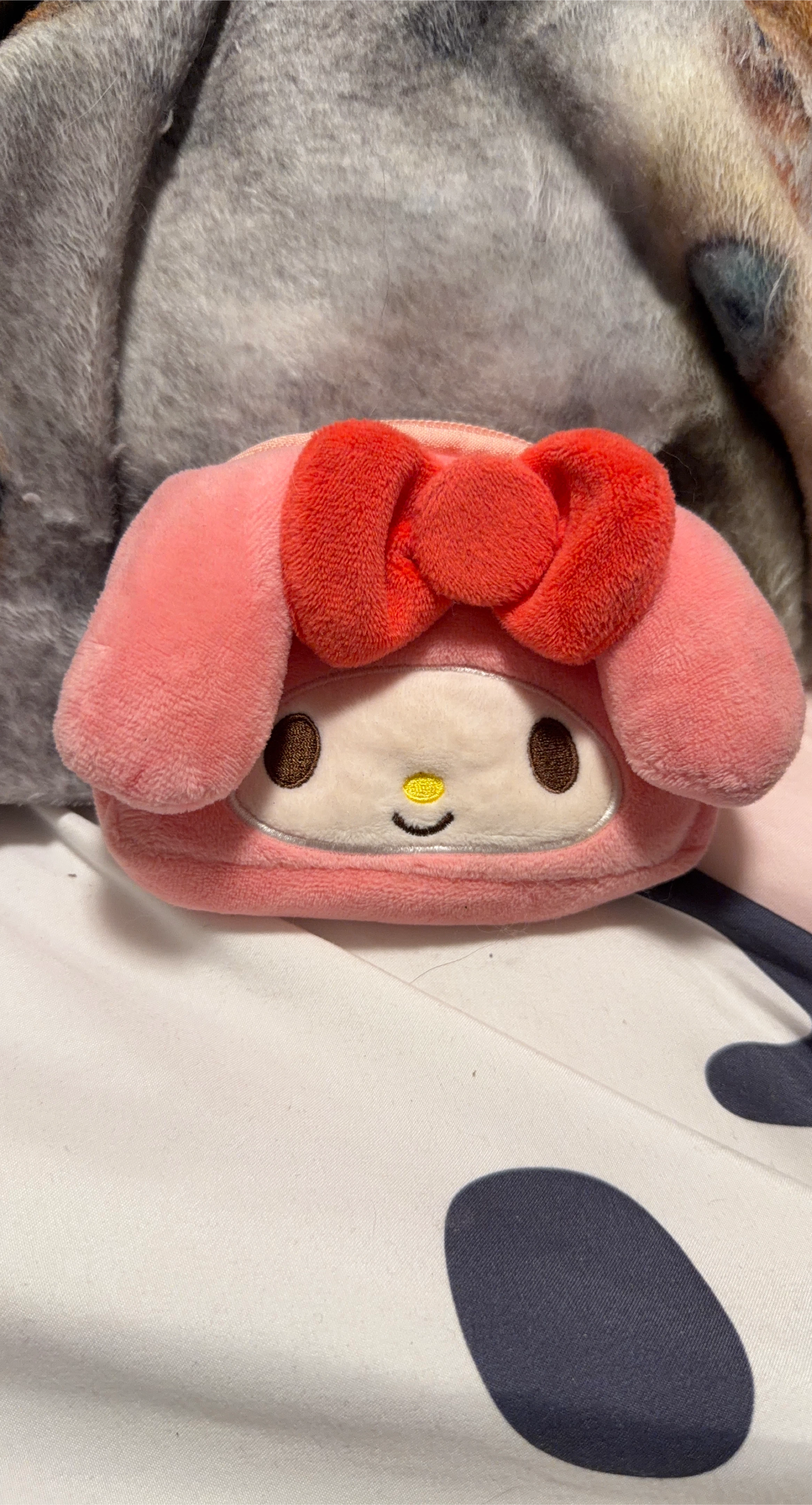 72Super cute My Melody plush pouch! Perfect for storing small items or using as a coin purse. It's pink with a red bow and has a soft, plush texture. Great for any Sanrio fan!