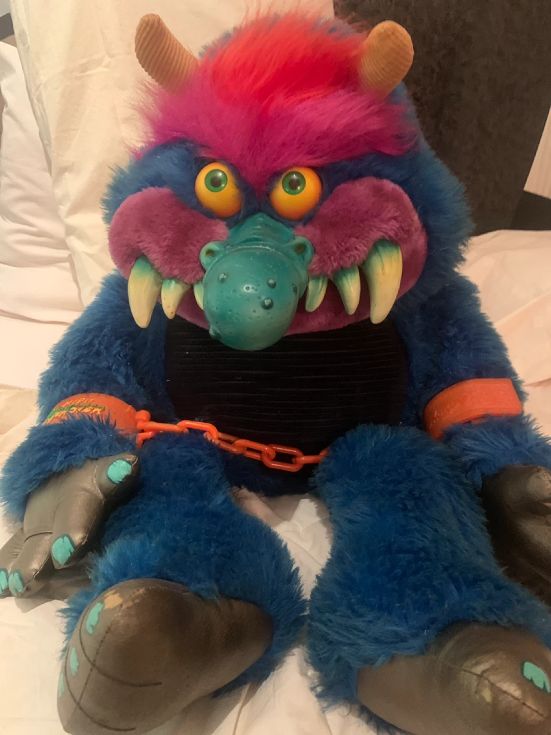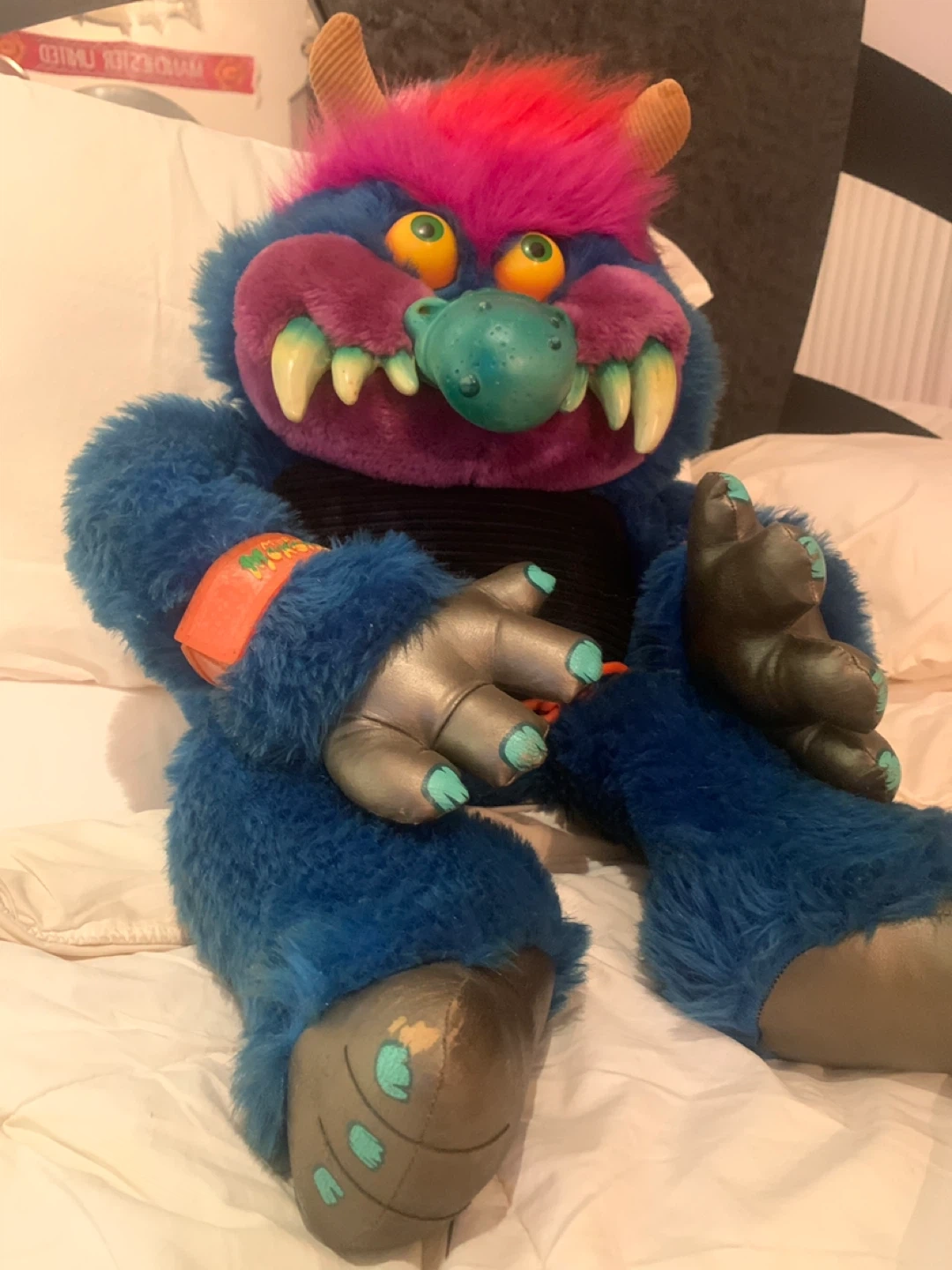Selling a vintage My Pet Monster plush toy! This guy is a classic and would be a great addition to any collection. He's got that signature blue fur, the orange cuffs, and those goofy teeth. He does show some signs of wear on the feet, but overall he's in good shape for his age!