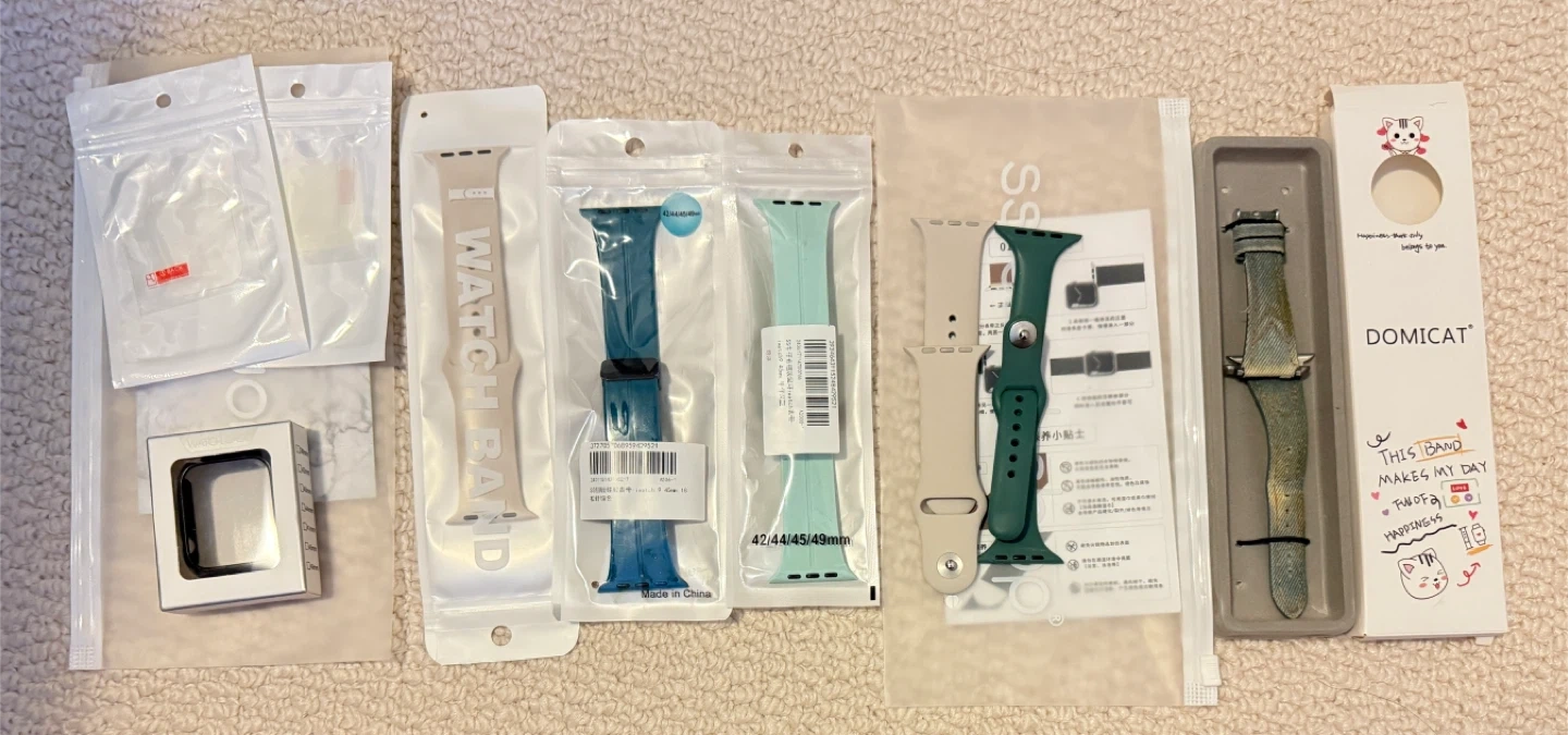 Selling a bundle of Apple Watch bands, case and film . Includes various colours and styles, suitable for 45mm Apple Watches. One band is a Domicat brand. All are in great condition and ready for a new wrist!