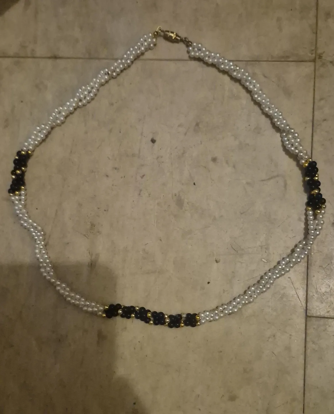 This is a double-strand necklace made with white faux pearls and black beads. It has a gold-toned clasp. The black beads are accented with small gold beads and arranged in a floral pattern along the strand.