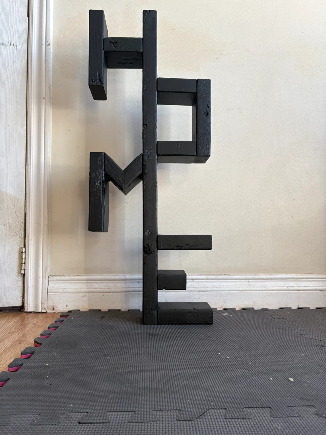 Unique black wooden display unit shaped like the word "HOME". It's made of solid wood and painted black. This piece is great for displaying small plants, photos, or knick-knacks!