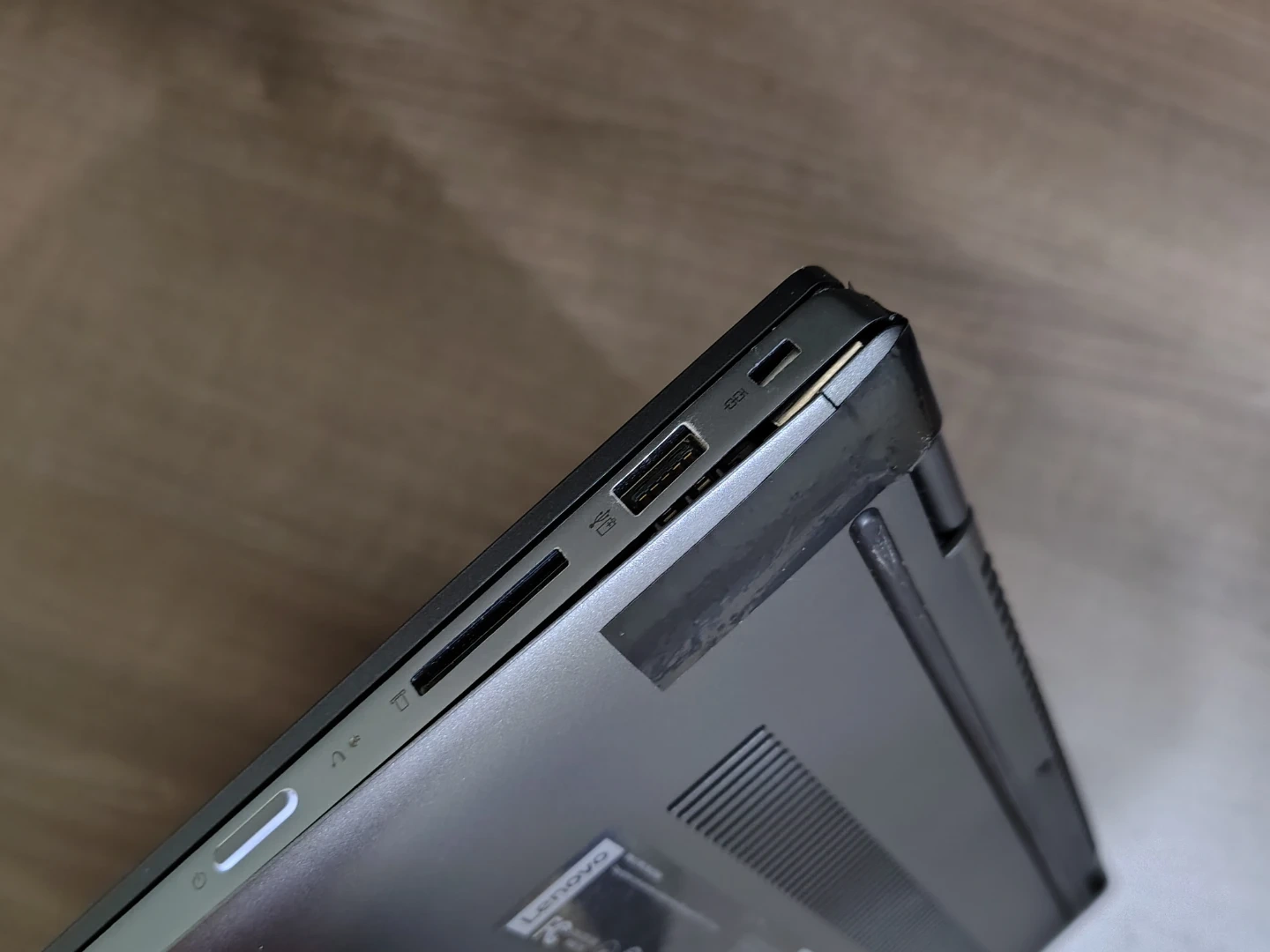 The right-side hinge panel is cracked and came loose, but it has been secured with tape. This does not affect performance in any way — the laptop works perfectly.