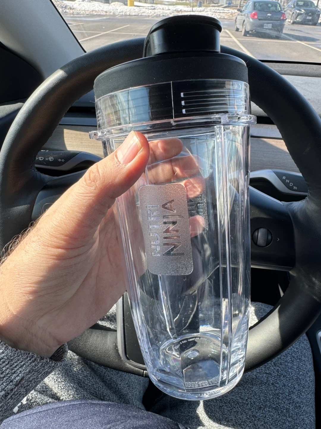 This is a Nutri Ninja blender cup. It's made of clear plastic and comes with a black lid. Great for smoothies on the go!