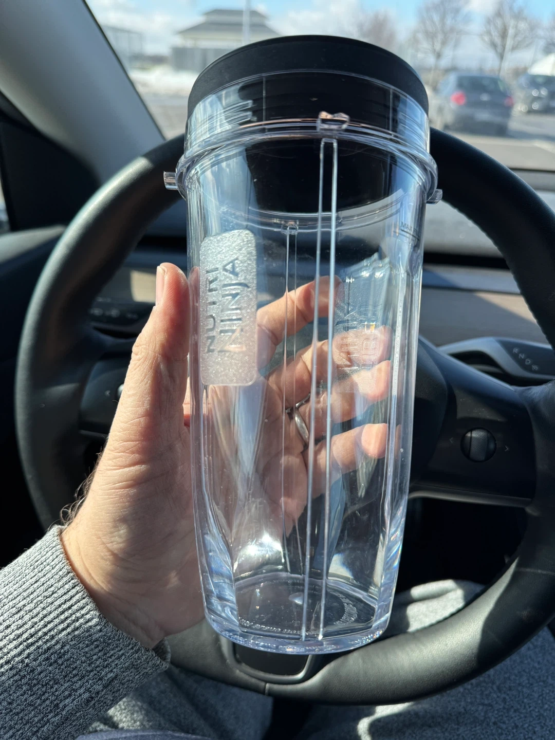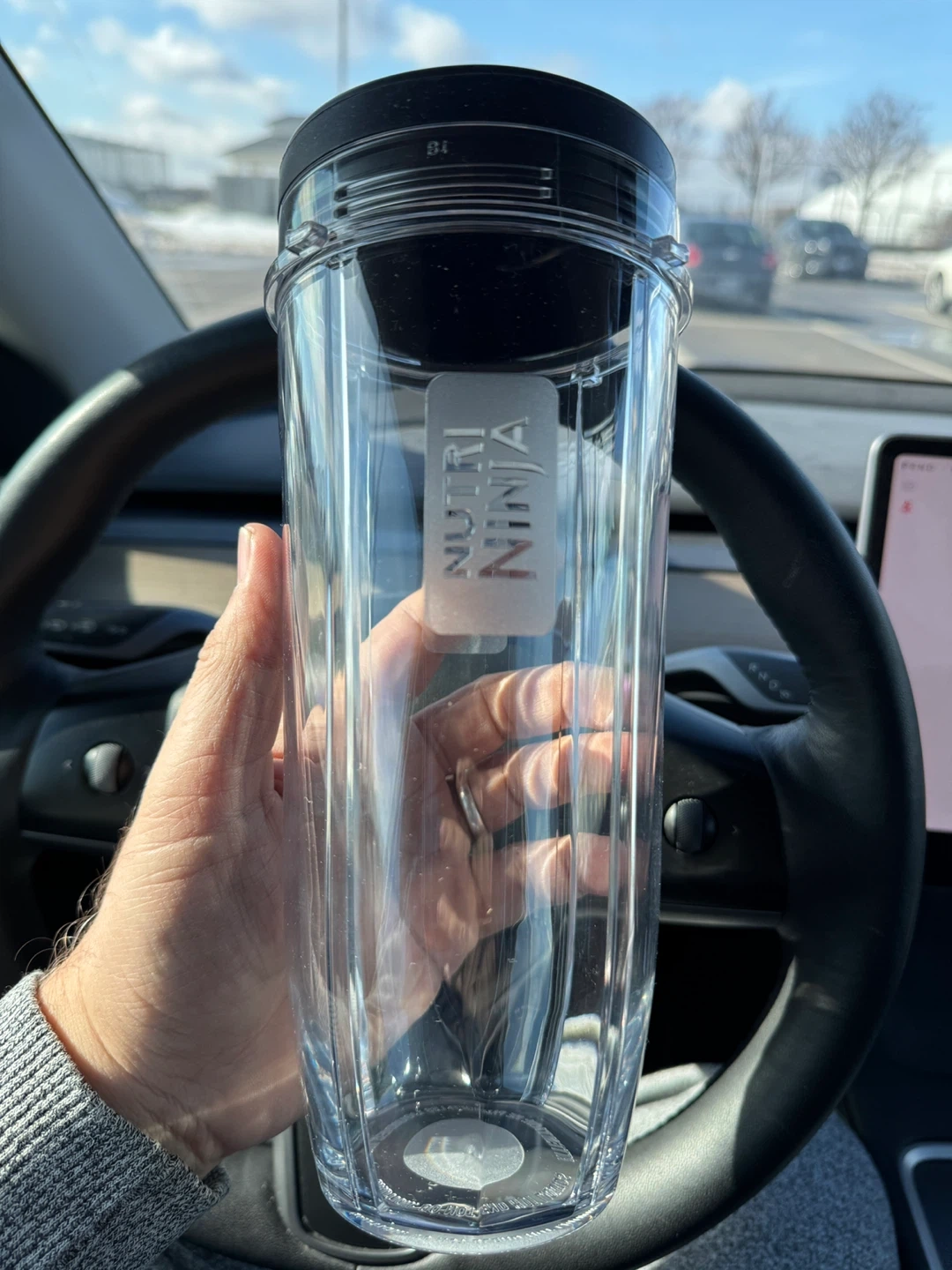 This is a Nutri Ninja blender cup. It's made of clear plastic and comes with a black lid. Great for smoothies on the go!