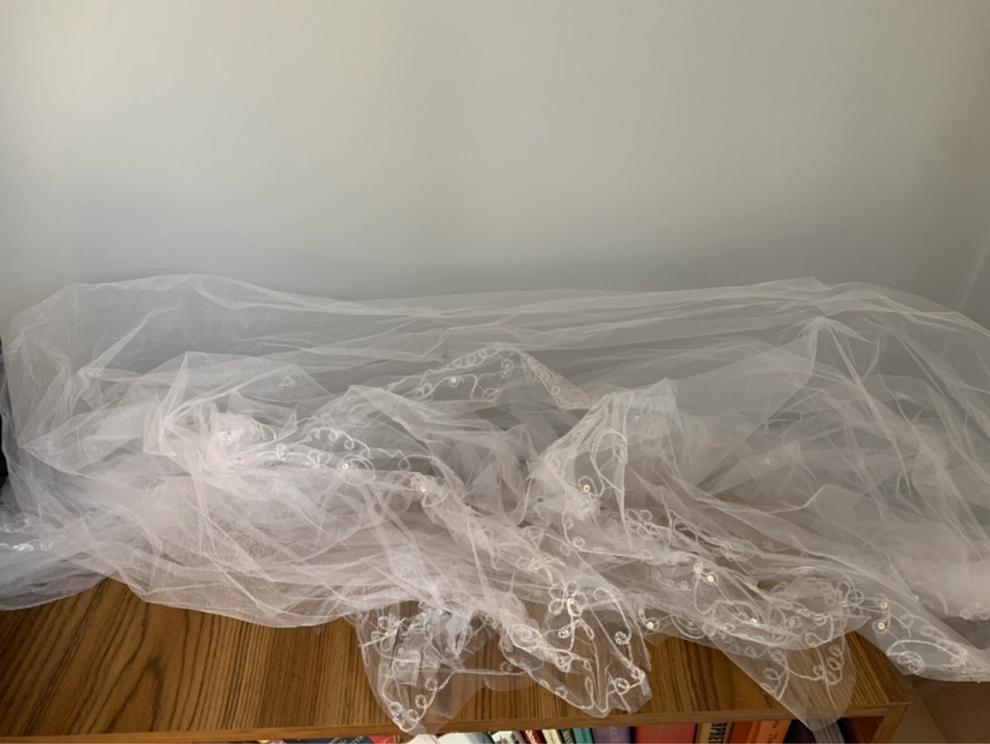 This is a beautiful white tulle long wedding veil. It features delicate lace trim along the edges with embroidered floral details and sequins. The tulle has a subtle shimmer to it. It's perfect for a wedding or special occasion!