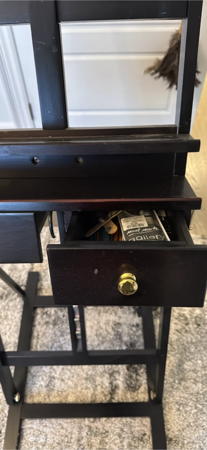 Selling a sturdy wooden art easel with two storage drawers. Includes various art supplies like paint tubes and brushes. Perfect for your studio! Get your creative juices flowing!