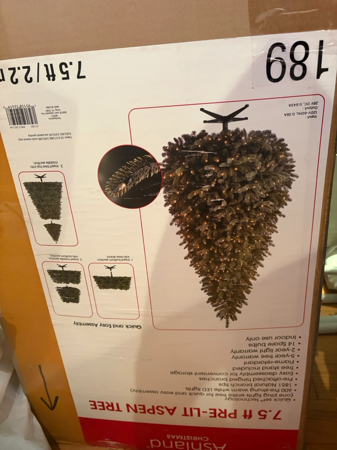 This is a 7.5 ft pre-lit Aspen Christmas tree from Ashland. It features 600 pre-strung warm white LED lights and 1851 natural branch tips. The tree is flame-retardant and includes a tree stand. It's designed for easy assembly and disassembly for convenient storage. Comes with 14 spare bulbs and a 2-year light warranty.