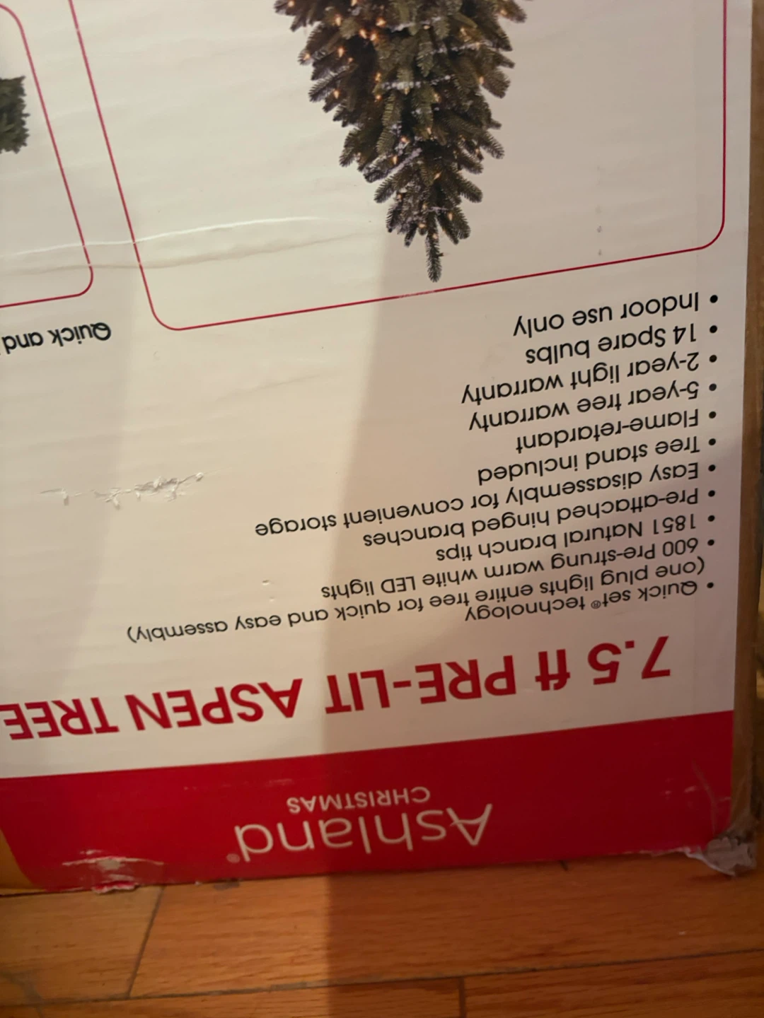 This is a 7.5 ft pre-lit Aspen Christmas tree from Ashland. It features 600 pre-strung warm white LED lights and 1851 natural branch tips. The tree is flame-retardant and includes a tree stand. It's designed for easy assembly and disassembly for convenient storage. Comes with 14 spare bulbs and a 2-year light warranty.