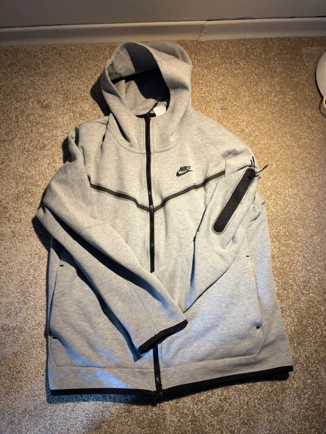 This is a Nike Tech Fleece full zip hoodie in grey. It's made with a soft fleece material for warmth. Includes zippered pockets and a hood. Perfect for staying comfortable on cooler days!