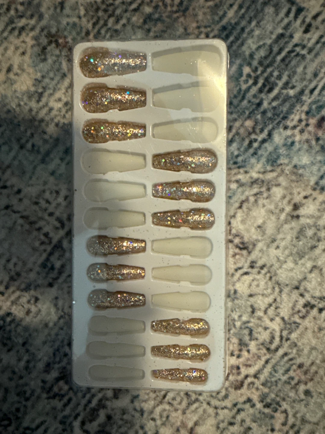 These are press-on nails with a glittery gold finish. They come in a pack of 16. The nails have a coffin shape and are a nice addition for any occasion!
