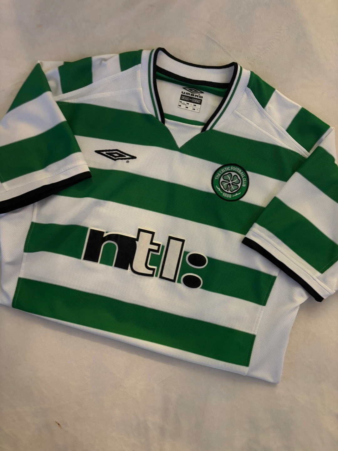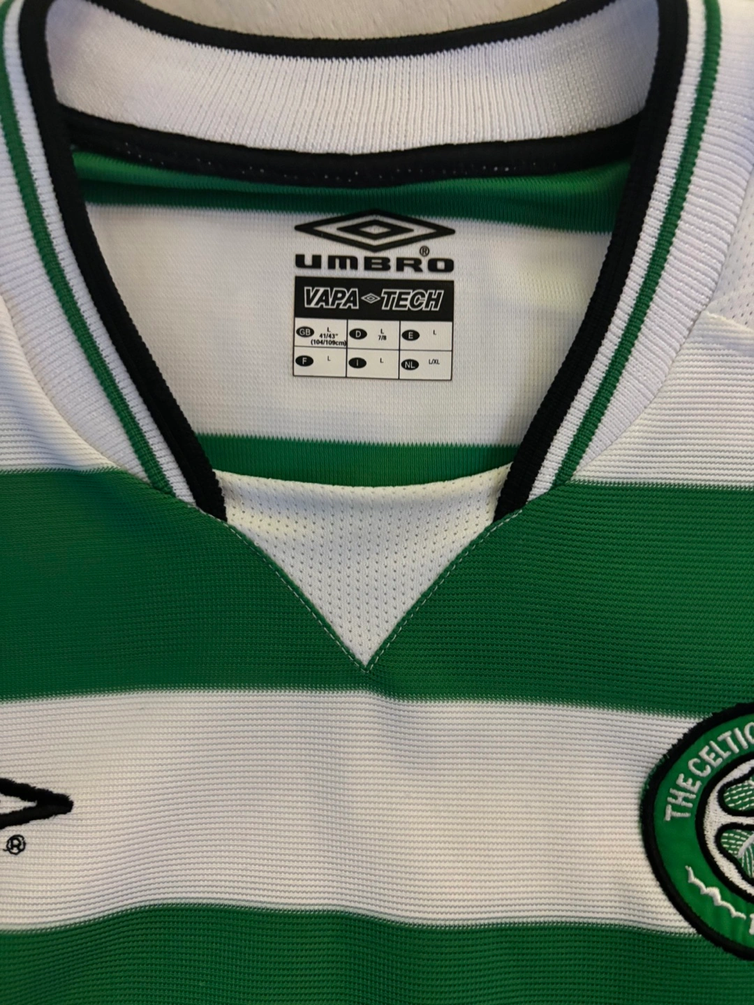 Men's Celtic Football Club home jersey. Green and white hooped design. Umbro brand. Size large. Vapa-Tech fabric. NTL sponsor logo.