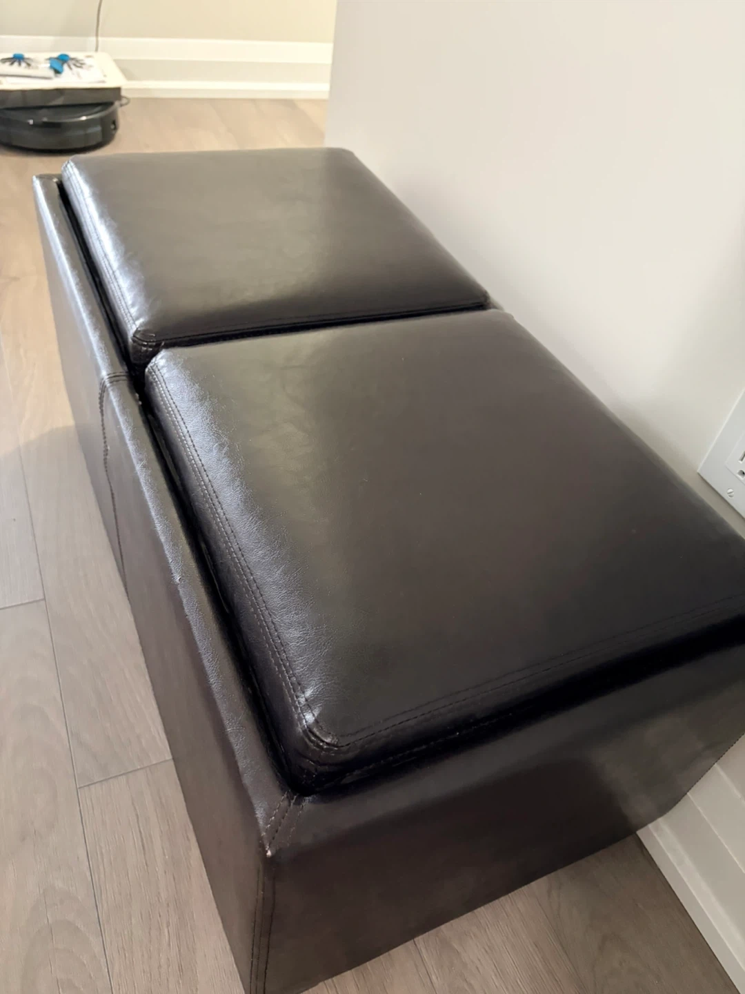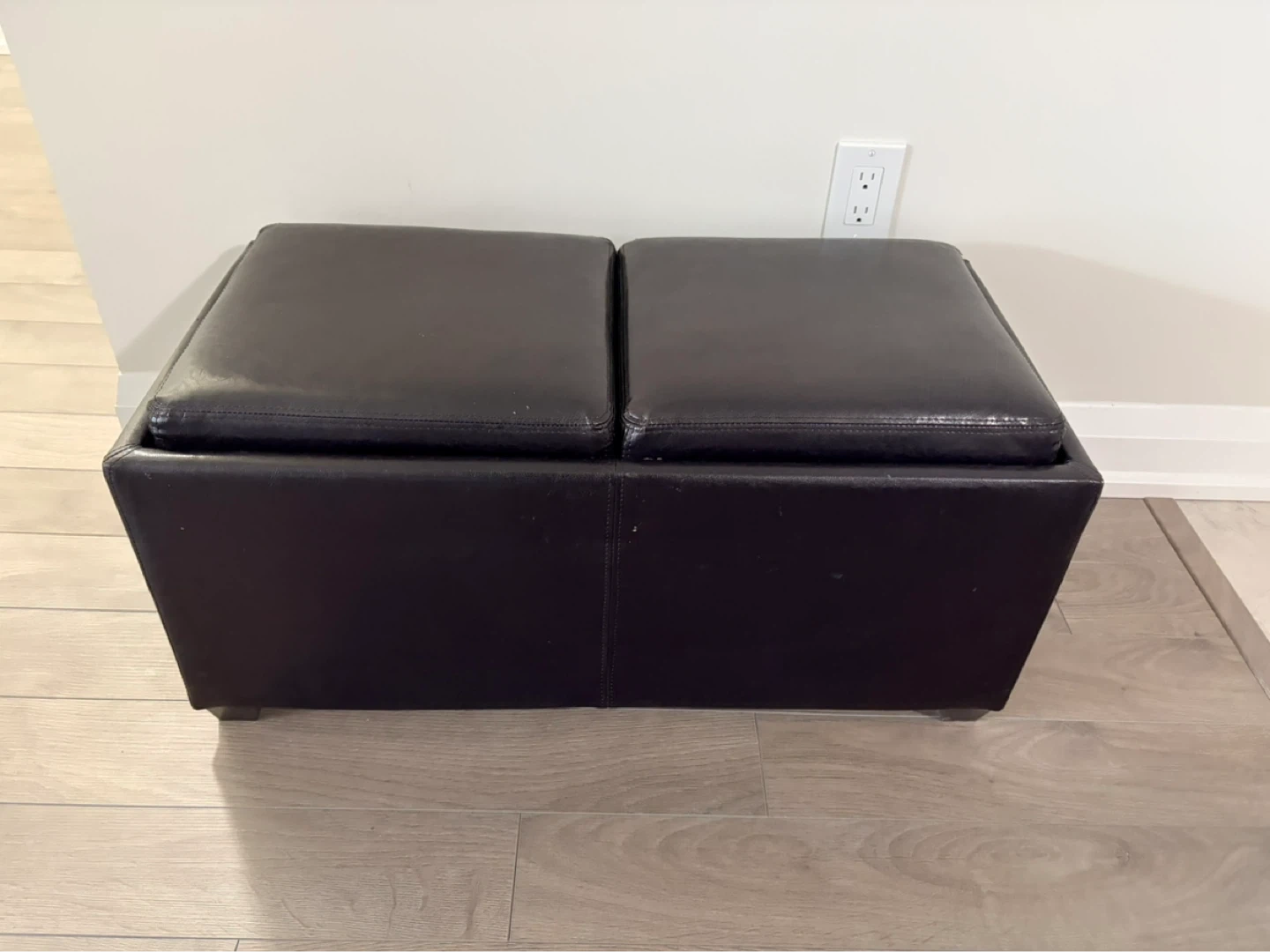 This faux leather storage ottoman bench is a dark brown colour. It has two hinged lids for access to the storage compartment inside. The bench offers both seating and storage.
