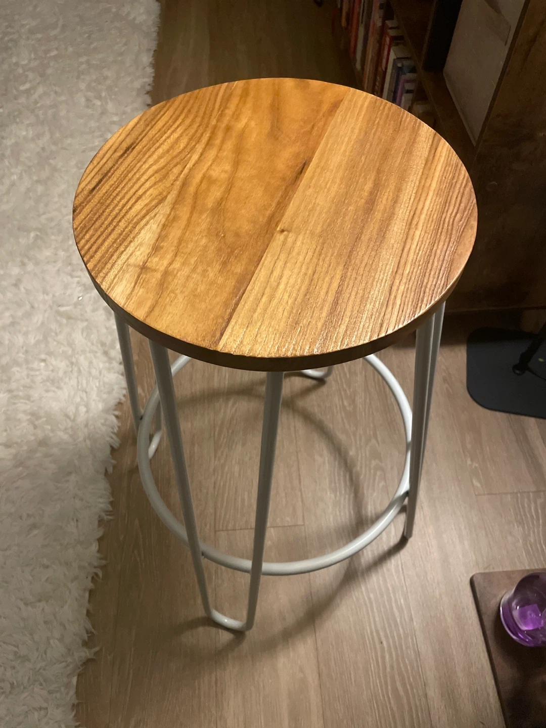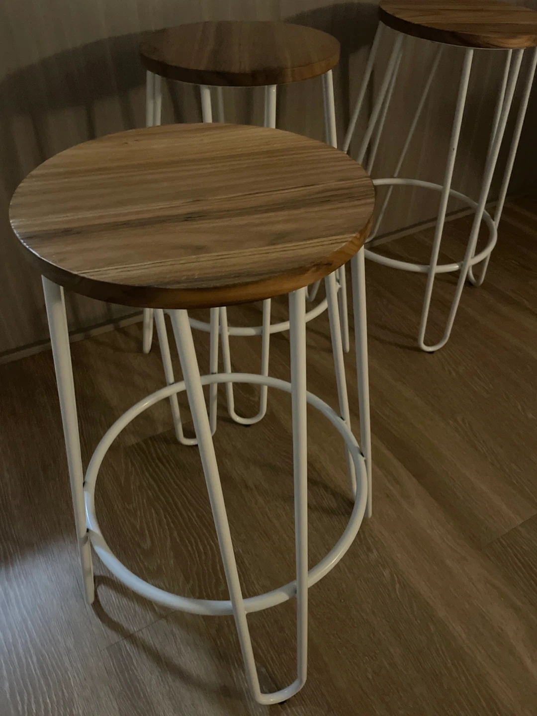 Selling a set of three stylish bar stools. They feature round wooden seats and sturdy white metal hairpin legs. These stools are perfect for a kitchen island or home bar setup. A great addition to any modern living space! $30 each or $90 for all three