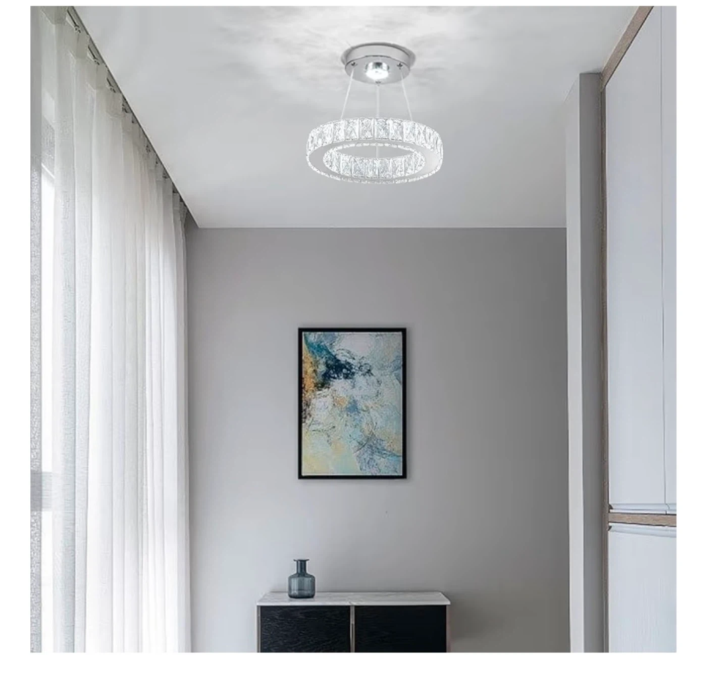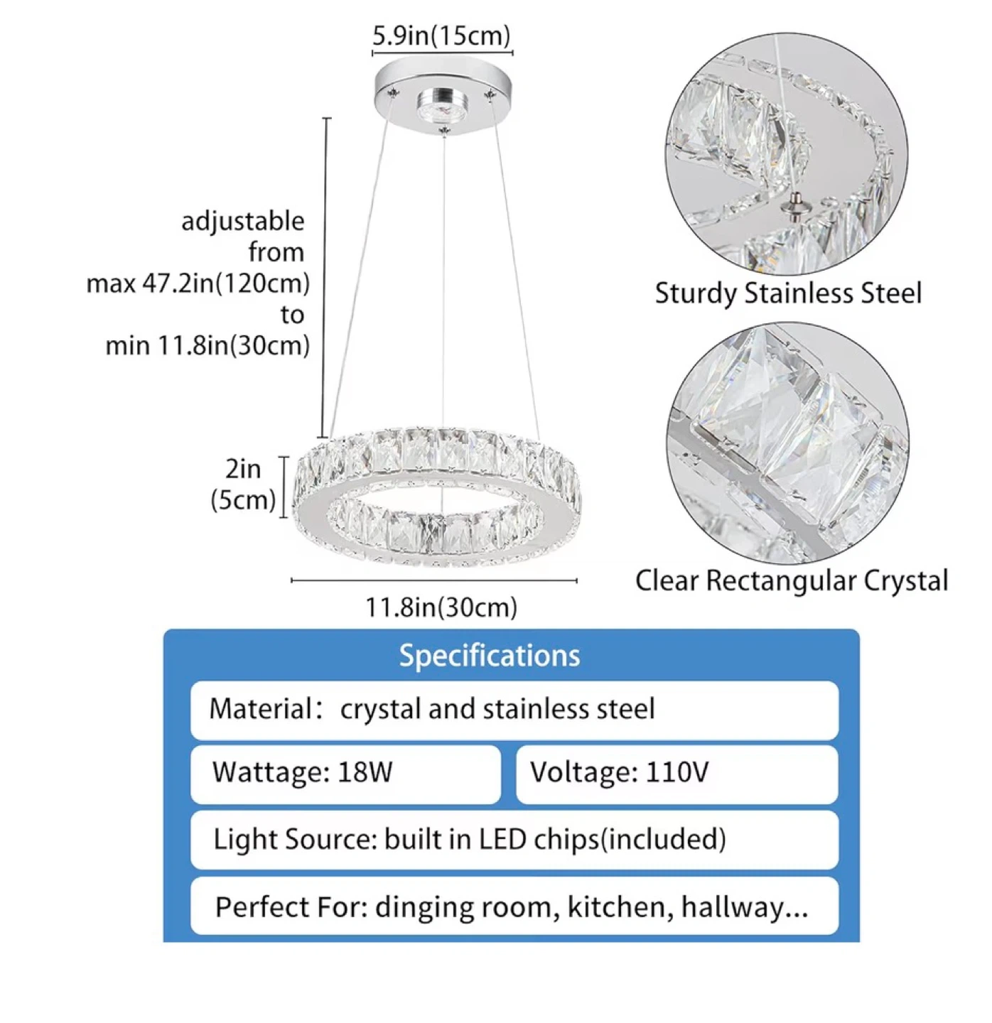 This stylish pendant light features a round, flush mount design with clear rectangular crystals and a stainless steel frame. It's adjustable from 11.8 to 47.2 inches. The built-in LED chips provide 18W of cool white light.