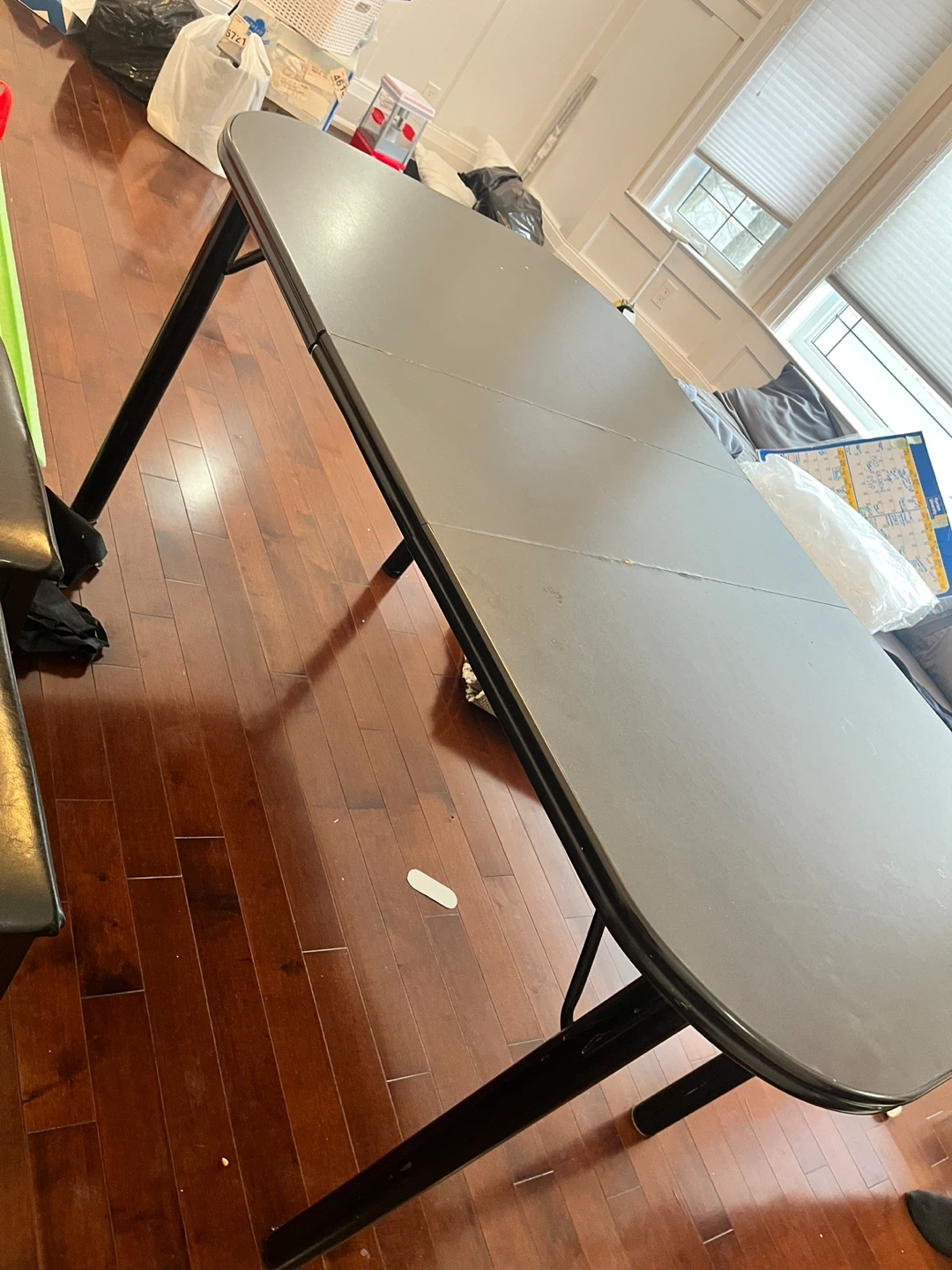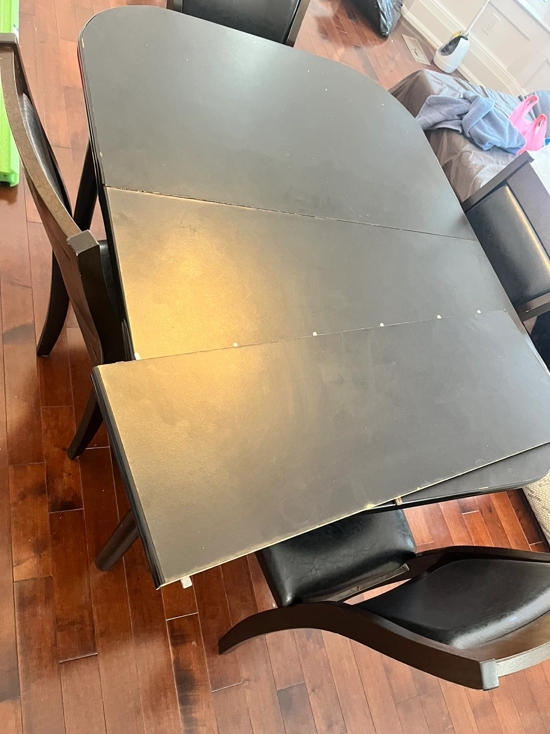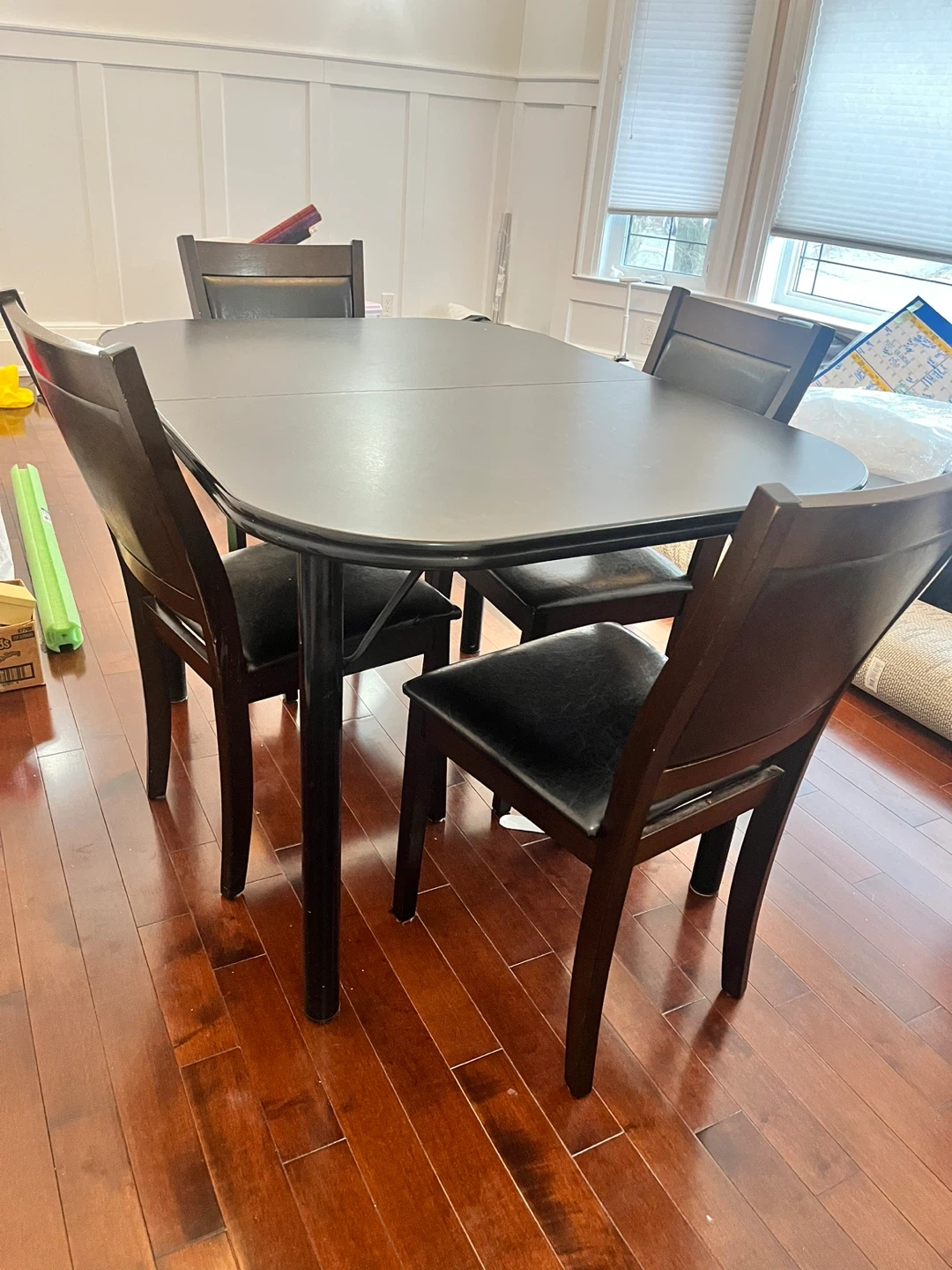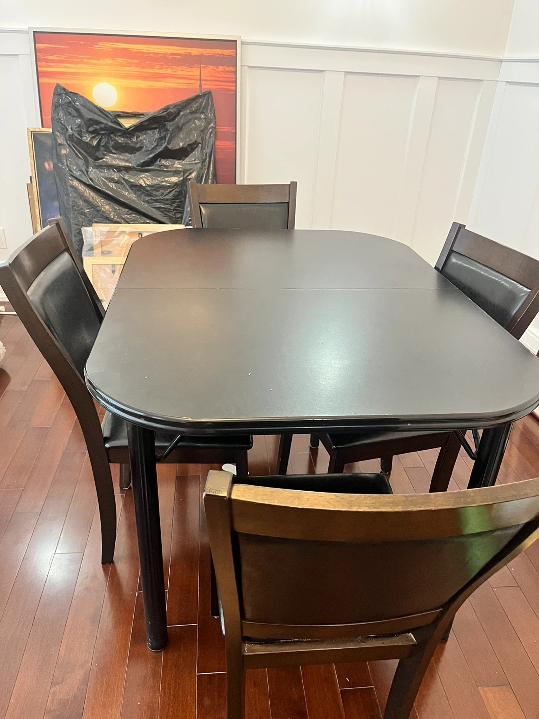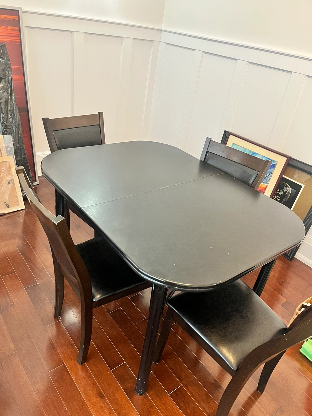 Black expandable dining table with four matching chairs. Tabletop and chair seats are upholstered in black faux leather. This set is perfect for smaller dining spaces or kitchens!