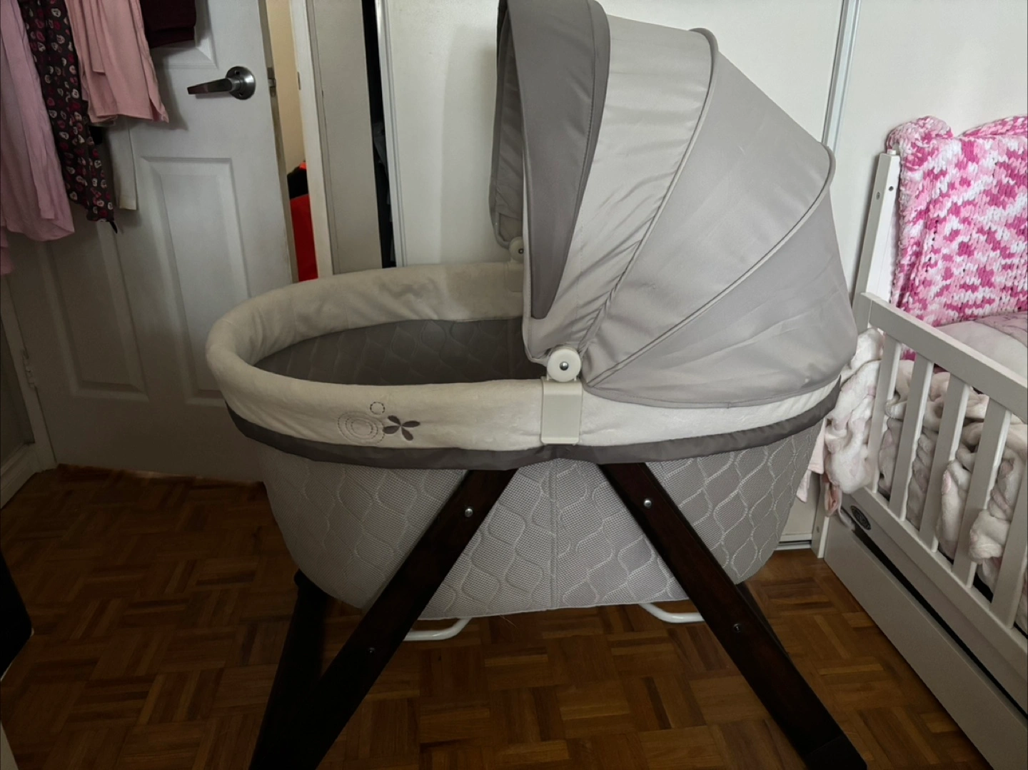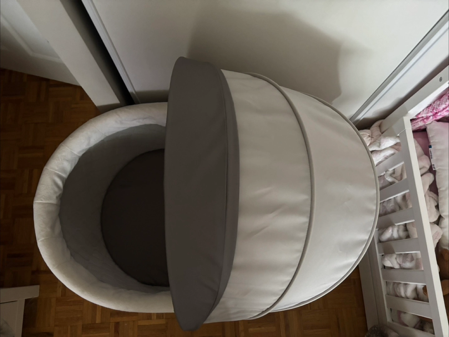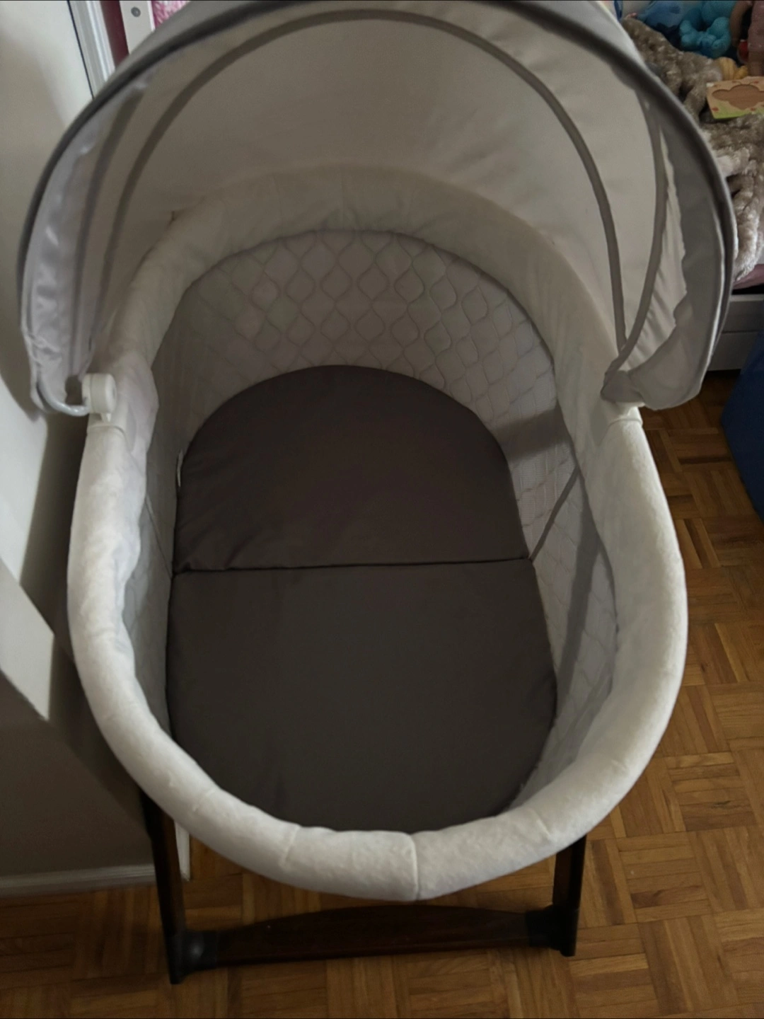 Adorable baby bassinet, grey and white. Features a retractable hood and padded mattress. Includes a supportive newborn pillow with a cute floral pattern. Perfect for newborns. Easy to assemble and disassemble.